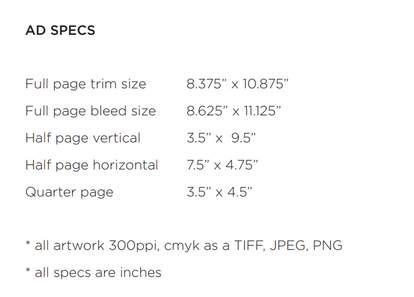 Please send ad copy in a Microsoft Word document or .txt format, with a 50-word limit. Images must be at a resolution of 300 ppi at 100% of the final output size in one of the following formats: tiff, jpeg, or eps