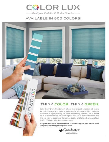 T H I N K COLOR. T H I N K GREEN. Color Lux™ from Comfortex® offers the largest selection of colors for both cellular and roller shades in the window fashion industry. Available in light filtering or room darkening options, you’ll never have to compromise on color again. Visit us at comfortex.com and find out how to become a Comfortex dealer and take advantage of our 5 - 10 - 15% Color Lux discount promotion. For your free swatch showing our 2016 color of the year, email us at comfortexmarketing@comfortex.com.