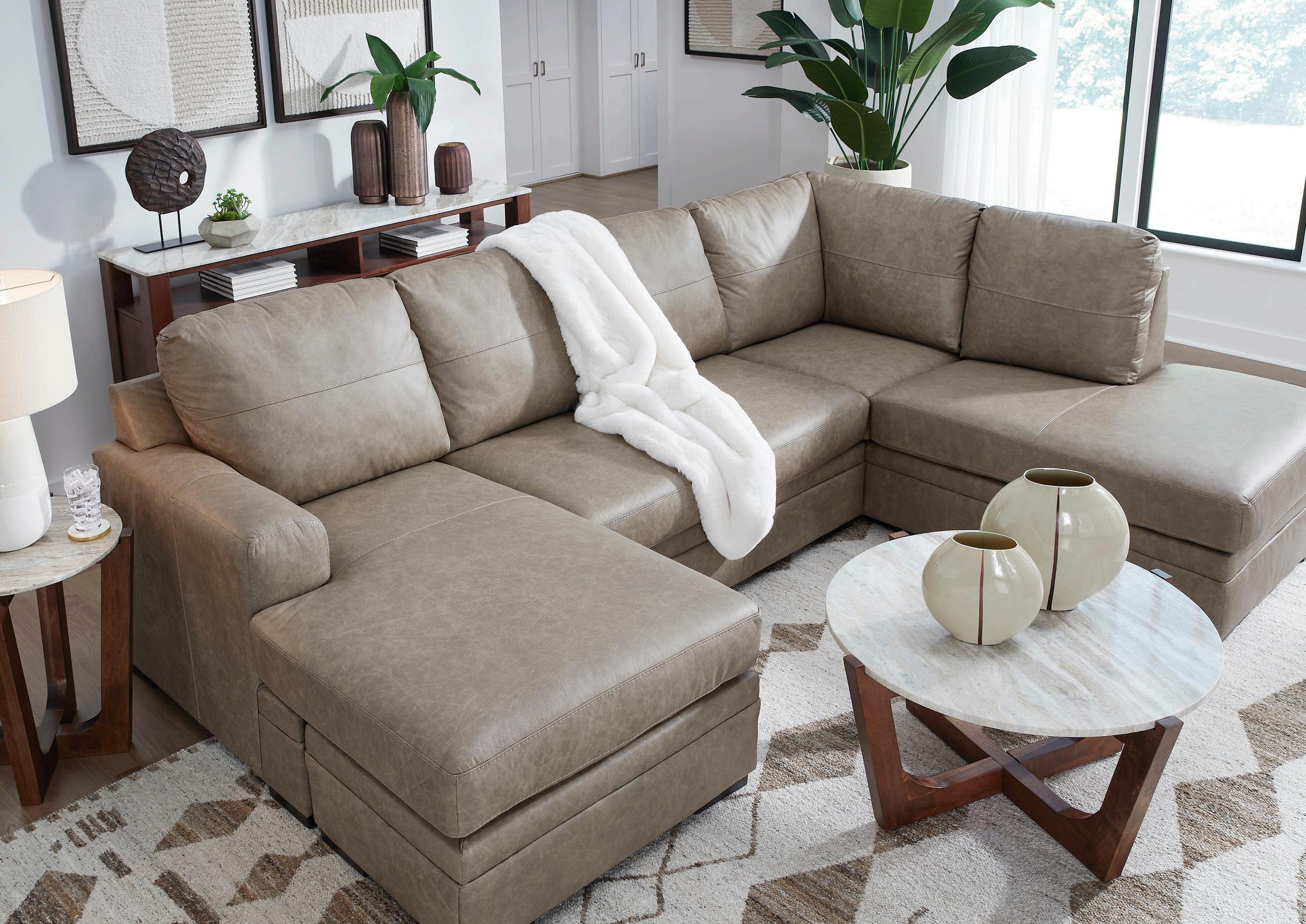 This sectional with chaise prioritizes comfort to fit your modern lifestyle, with richly neutral leather and faux leather upholstery embracing you in irresistibly soft seating.