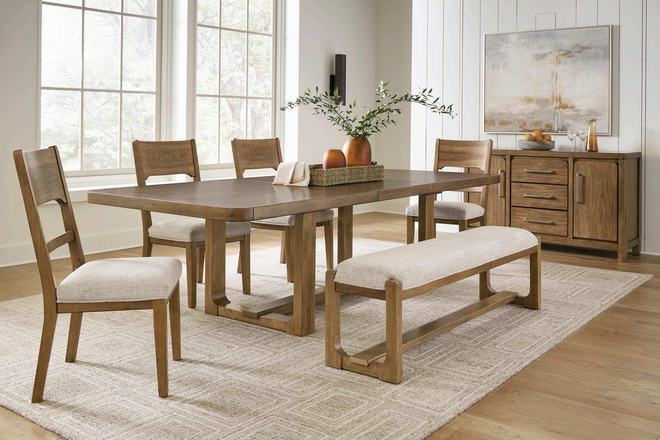 While full of poise, this dining set remains completely practical. The cushion seat invites you to linger longer at the table and a smooth extension feature serves up plenty of space for family and guests, defining your dining room with reliable function and style.