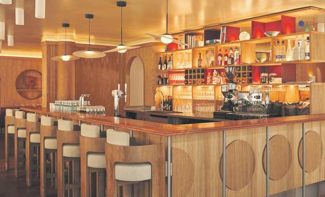 Nora welcomes guests into a warm space clad in wood, with vibrant LPs on its shelves