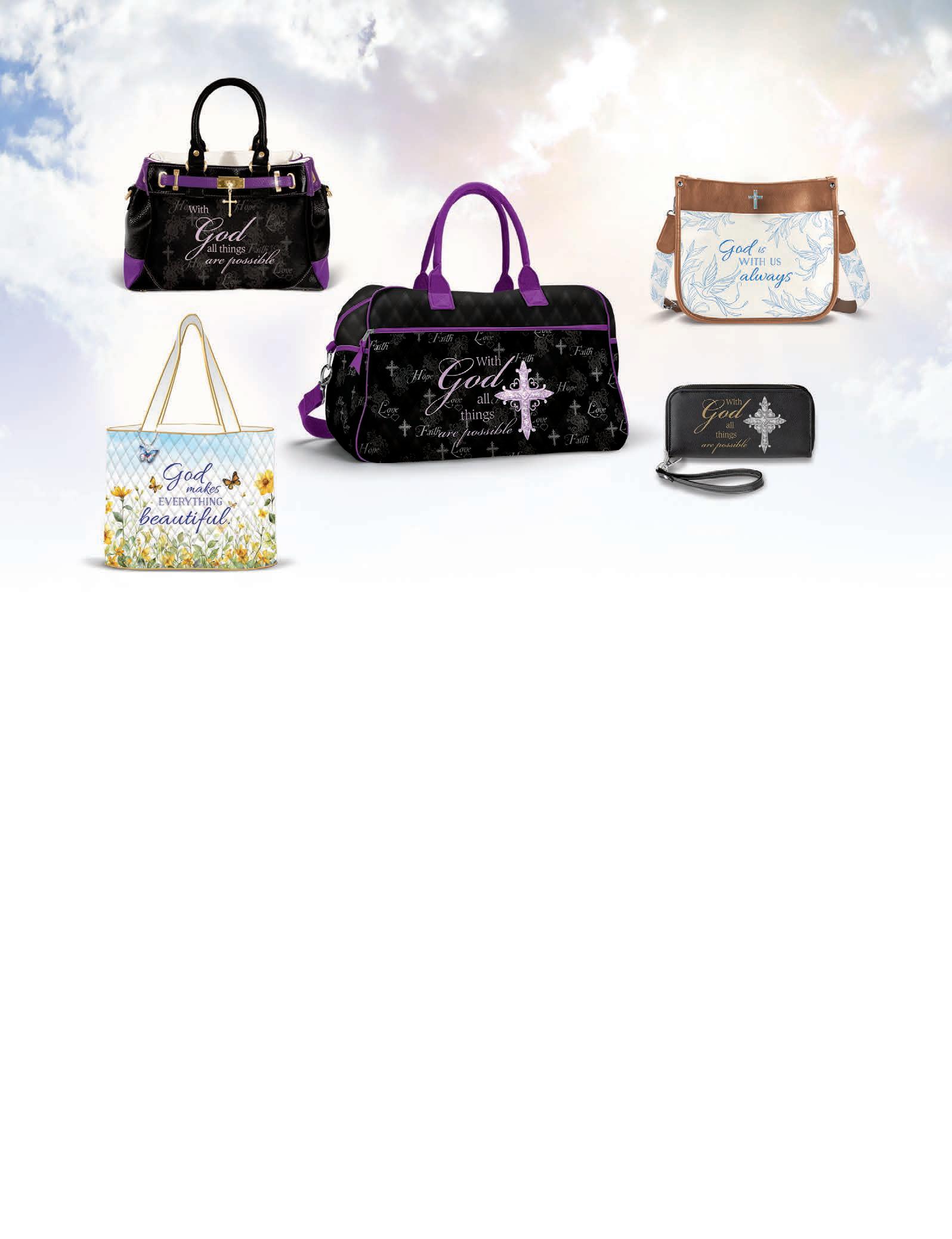 Handcrafted from soft, pebbled faux leather with bold color combinations of black and purple, the front of this bag features the phrase, With God All Things Are Possible, in a beautiful script surrounded by a repeating pattern of the sacred words Faith, Hope, and Love. Other design details include a zip-top closure, double faux leather handles, a 60" adjustable, removable cross-body strap, 2 interior slip pockets and 1 exterior zippered pocket. A gold-tone cross set with a sparkling crystal suspends from the coordinating belt-style accent. Imported. $129.99, payable in 4 installments of $32.50 each (plus $19.99 s&s*)