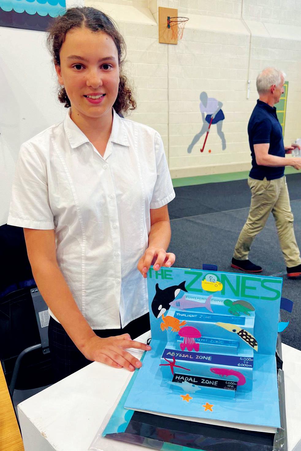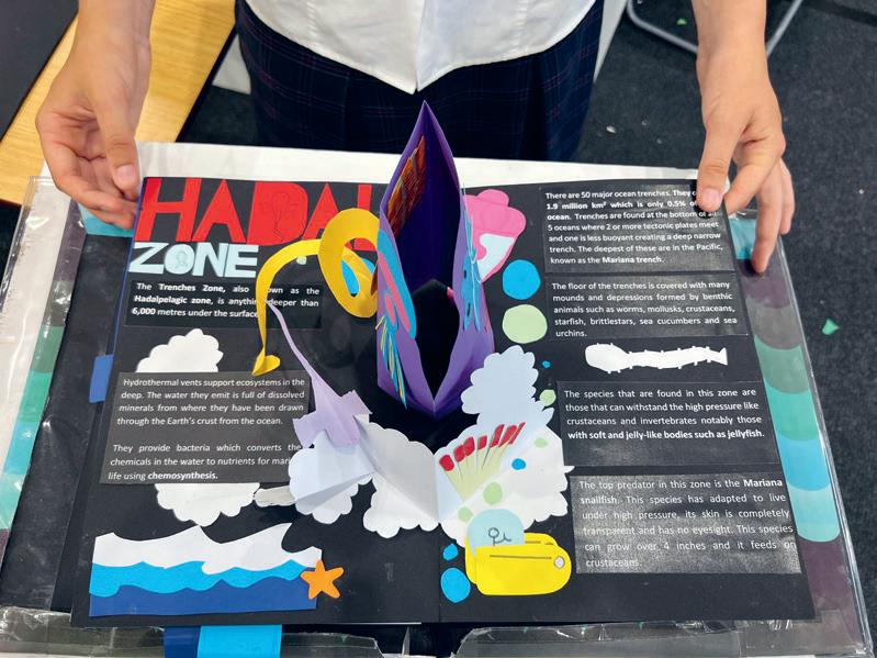 Sasha’s project, which is called ‘POP Into the Deep’, introduces each of these five underwater zones, starting with the Sunlight zone, which is closest to the surface, before diving deeper to explore the Twilight zone, Midnight zone, Abyssal zone and, finally, the Hadal zone. Each page is full of fascinating facts – did you know, for example, that there are more than 50 major deep-sea trenches at the bottom of the ocean? – and colourful pop-ups of some of the extraordinary creatures you can find there. Well done Sasha!
