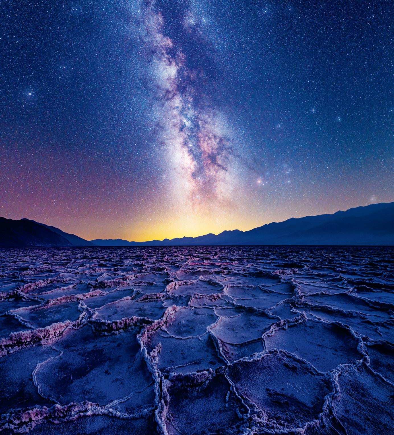 The bright band of stars in the sky are among billions in the Milky Way. A continual process of freezing, thawing and evaporation has created the hexagon-shaped mud flats on the ground below.