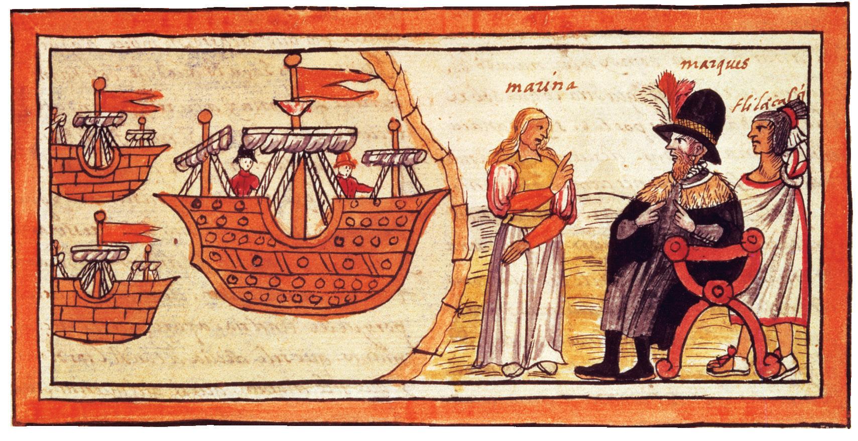woman named Malintzin, who spoke both Mayan and Nahuatl (the language of the Aztecs). Now Cortés could speak Spanish to Aguilar, who would translate his words into Mayan. Then Malintzin translated them from Mayan to Nahuatl. With these two, Cortés found he could make himself understood by just about anyone he might meet on his hunt for gold.