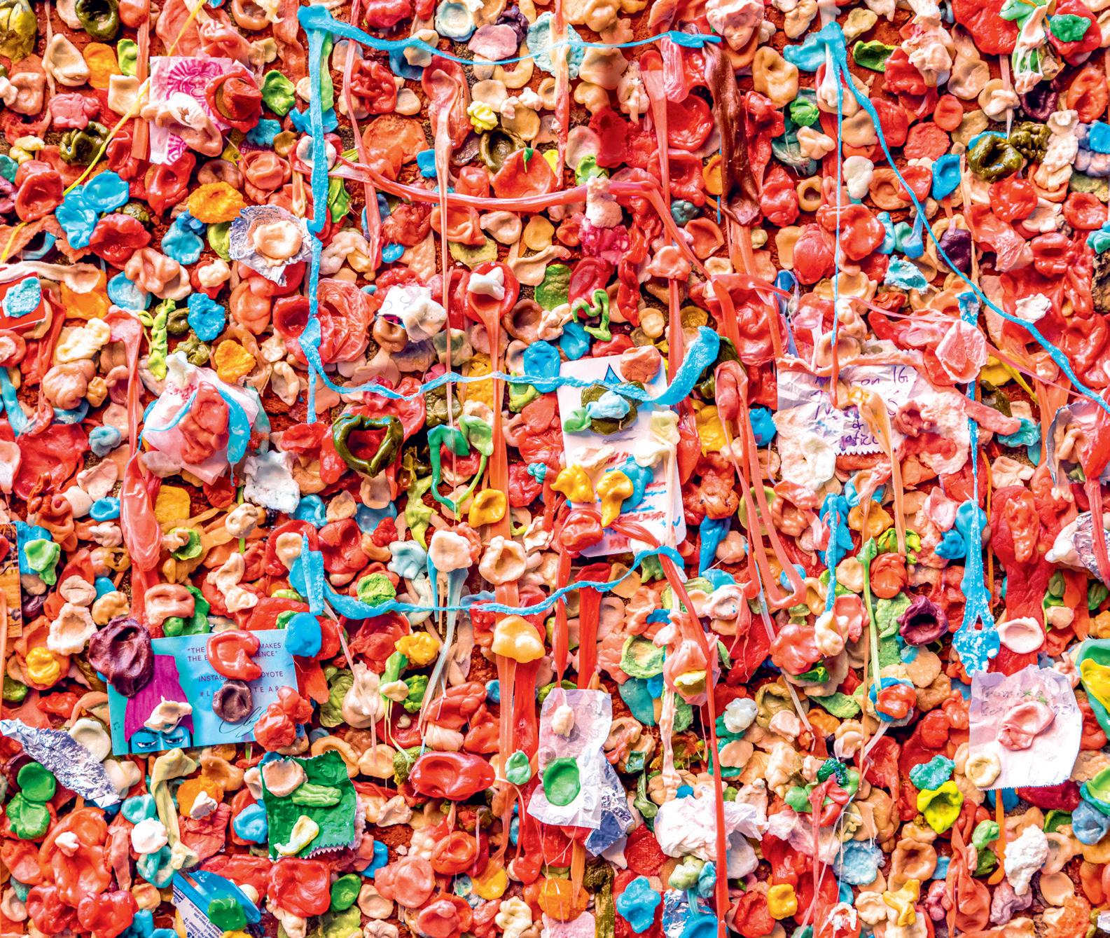A famous landmark known as the Gum Wall in Seattle, Washington, USA, features hundreds of thousands of pieces of chewed-up gum that visitors have left behind!