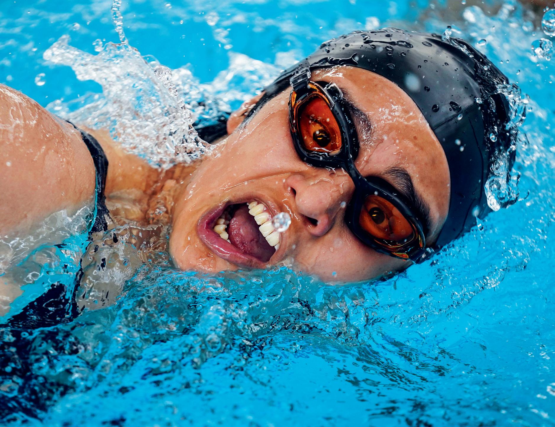 This highspeed female swimmer is straining to win a race in Colombia, South America. Like many swimmers, she lifts her head every four or five strokes in order to take a breath of air. The oxygen she inhales will help her muscles to work harder for longer. Learning how to breathe correctly is an important part of being a swimmer.
