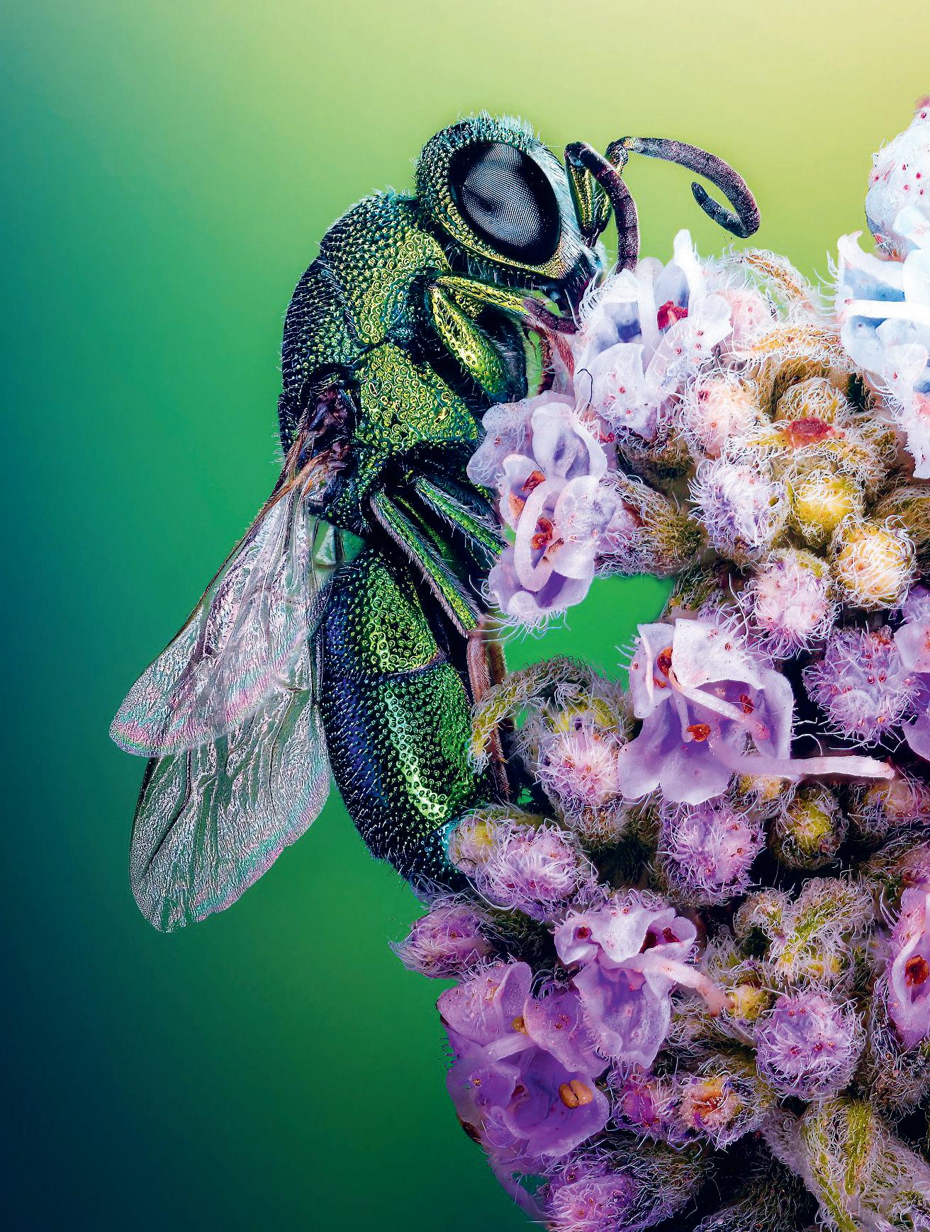 This colourful close-up image of a cuckoo wasp landing on a flower is an example of photomicrography, which is the technique of taking photographs through a microscope.