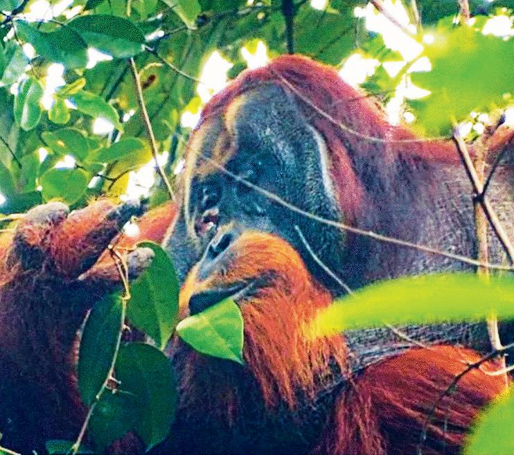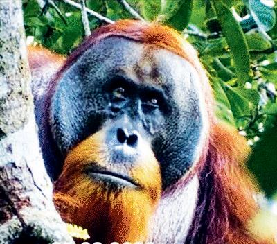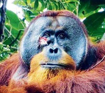 an injury in this way. The orangutan, called Rakus, suffered a large wound on his cheek. Researchers watched Rakus chew a plant with anti-inflammatory and anti-bacterial properties. He placed liquid from the plant on