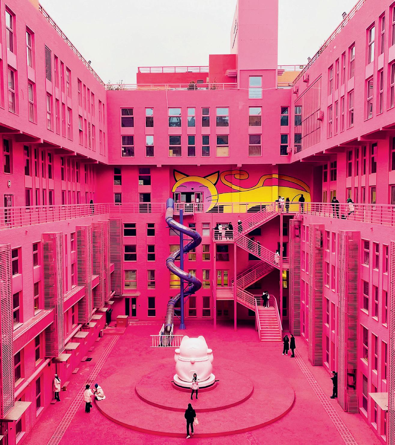 This section of the Five Cats Recreation Mall in Beijing, China, has been painted entirely in pink. A small playground with slides and cat decor provides extra fun, and the vibrant walls are a perfect backdrop for social media photo opportunities.