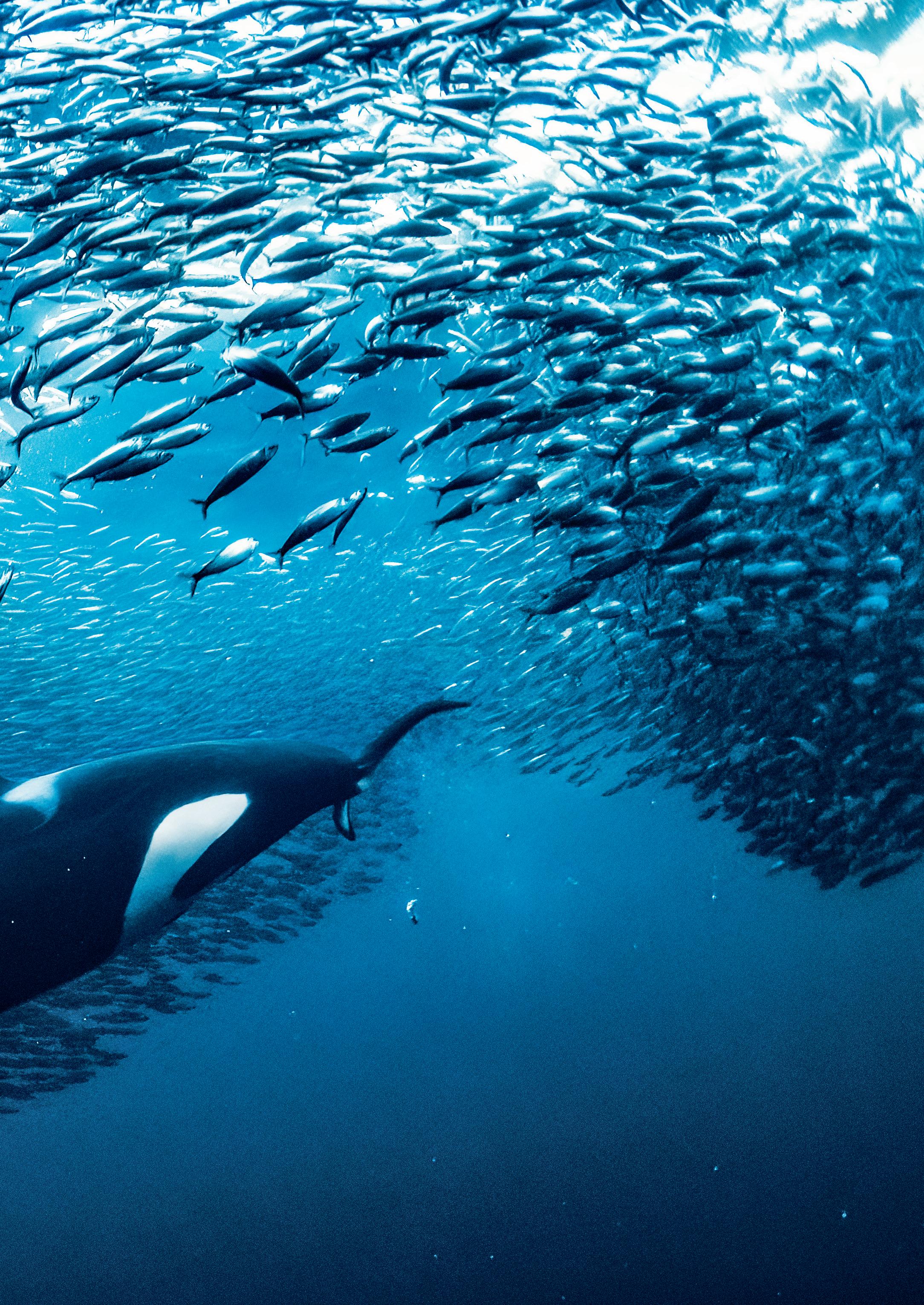 In winter, orca whales such as this one are attracted to large schools of herring that migrate into the fjords of northern Norway. Orcas herd the herring into a tight ball in what is known ‘carousel feeding’.
