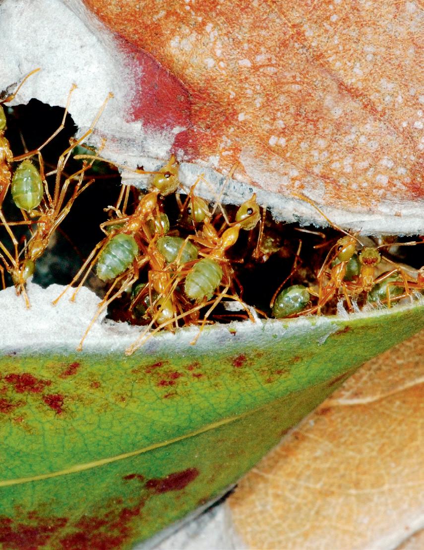 Weaver ants live in trees and create their unique nests by sewing leaves together using silk produced by the ants’ larvae. Their nests can stretch between trees for hundreds of metres!