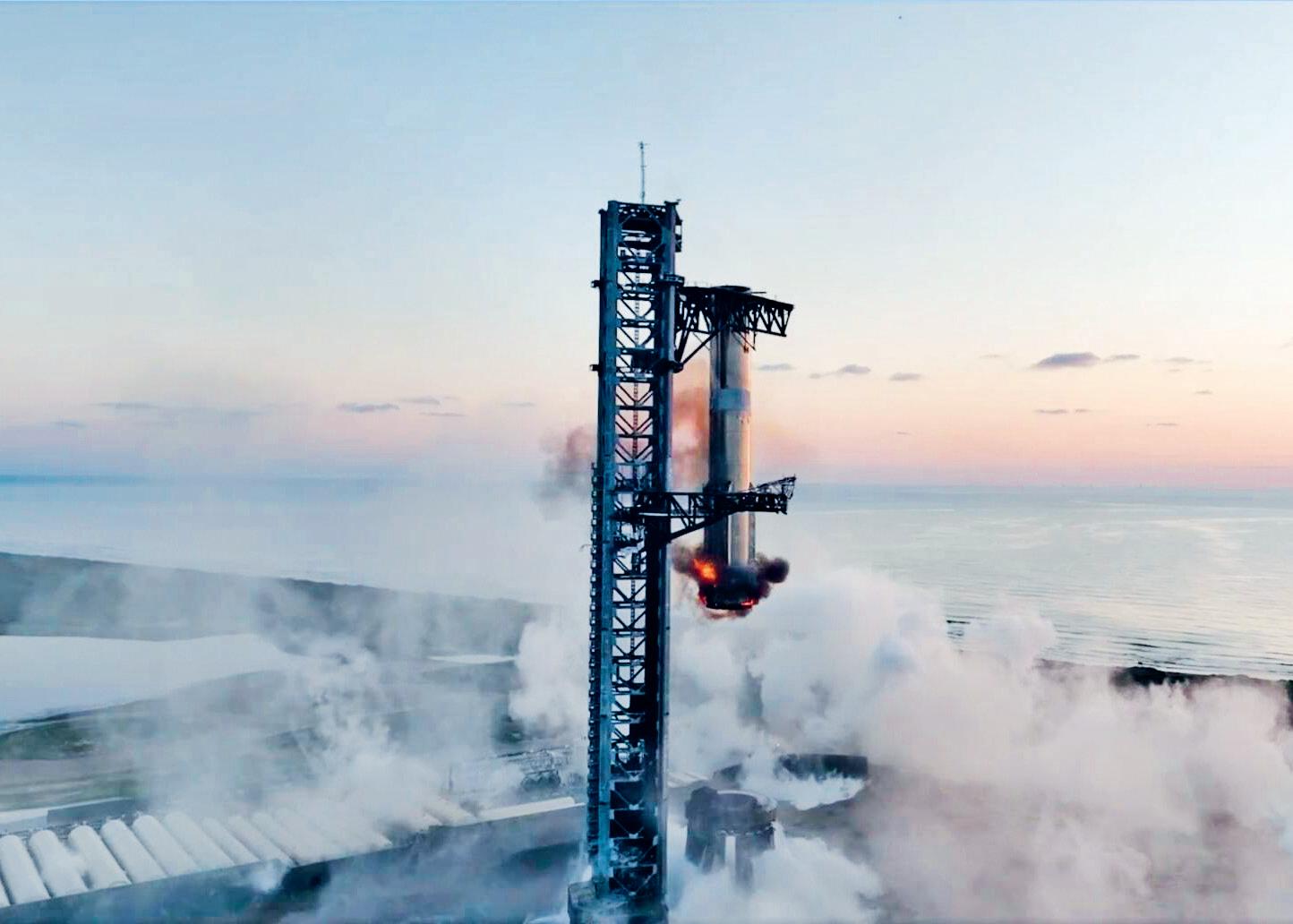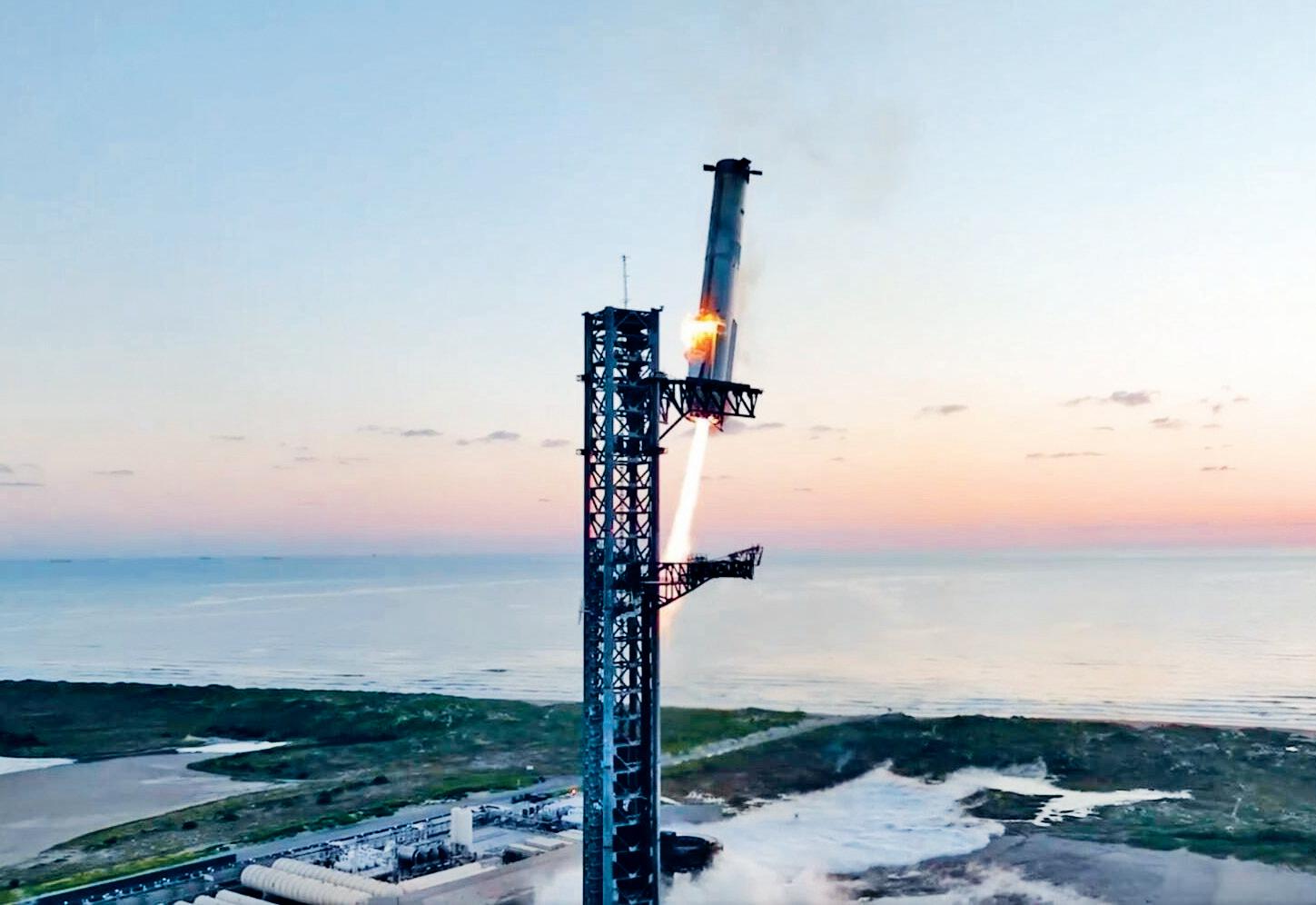 For the very first time, part of a space rocket has been caught in mid-air and returned safely to Earth. The SpaceX Starship blasted off from Texas, USA. The bottom part of the rocket, which usually falls into the ocean, was slowed down and caught by mechanical arms on its return. This test will help to design new reusable rockets.