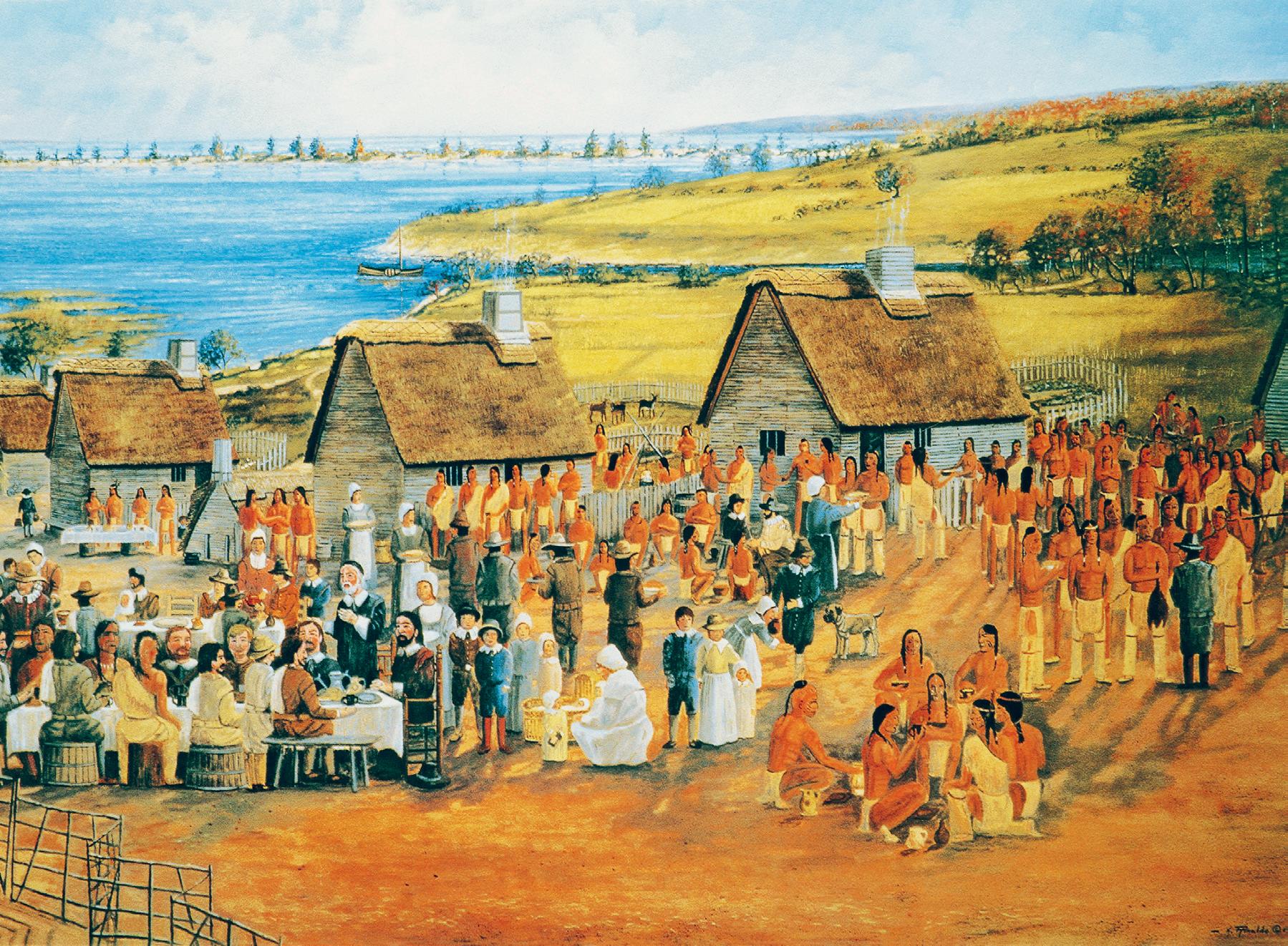 Above: a painting of the first Thanksgiving celebration, at Plymouth Colony in 1621.