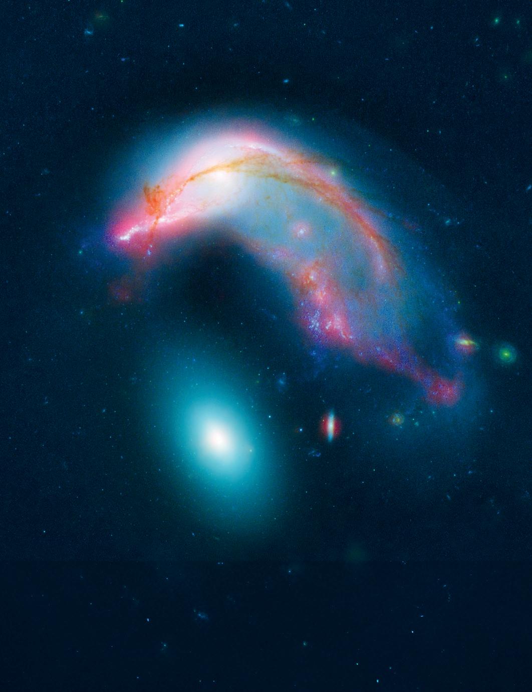 The ‘penguin’ galaxy is shown above, with the oval glow of its ‘egg’ below.