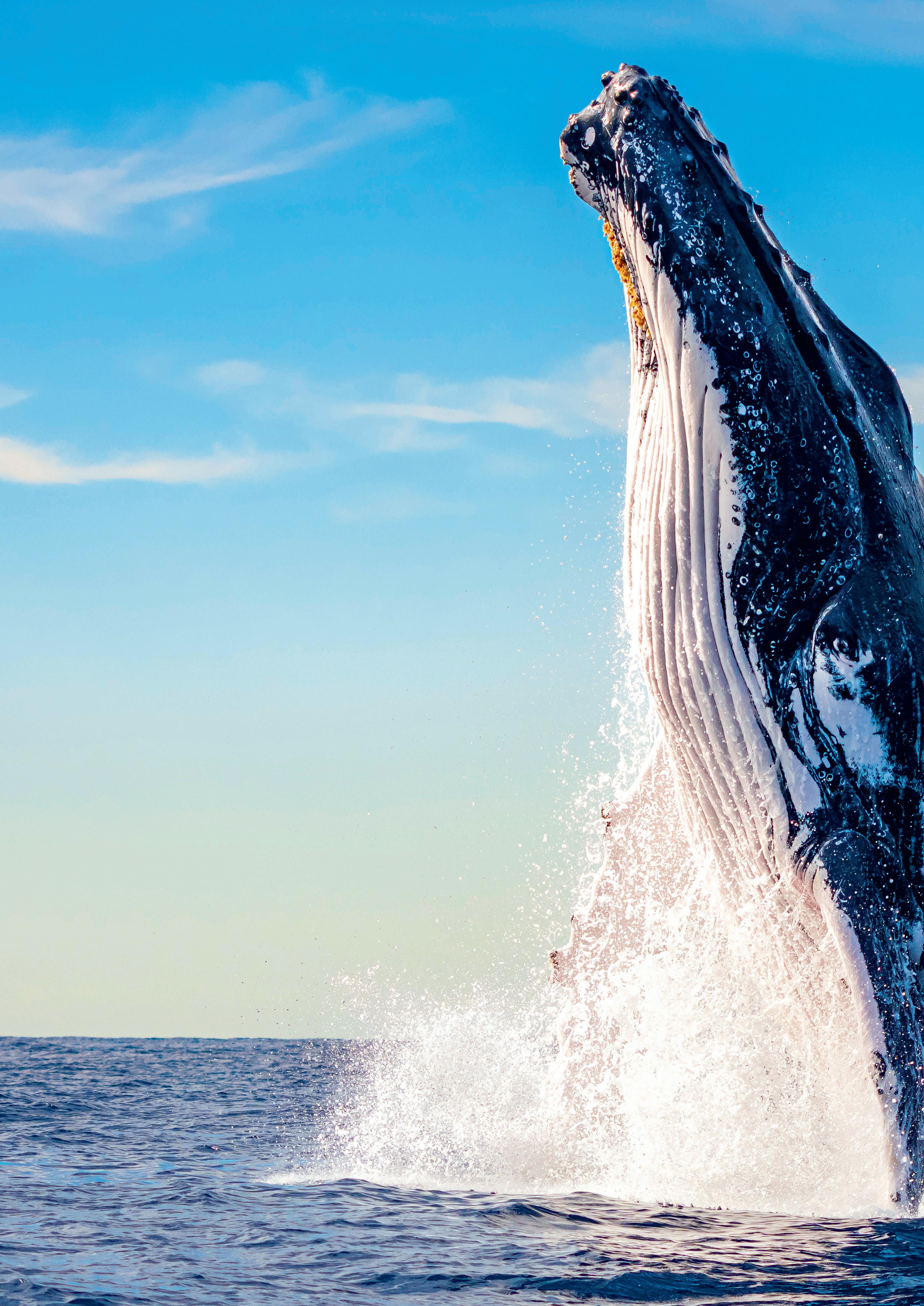 When whales propel themselves out of the water it’s called breaching. Whales breach for several reasons, including to communicate. The splash can be heard for miles underwater. To find out more about the way whales communicate, turn to page 42.