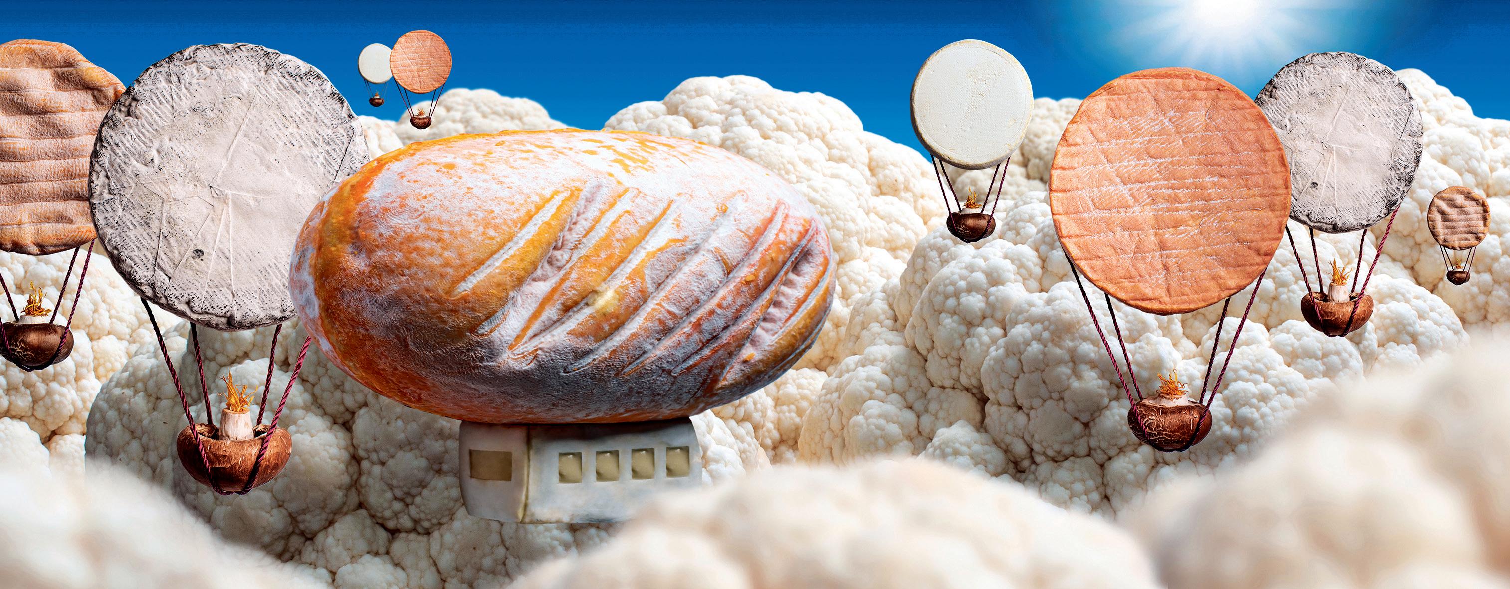 Look carefully at this scene and you will notice that it is all made from food! The balloons are cheese or biscuits. The baskets beneath are mushrooms. And the clouds are made from cauliflowers! It was created by a German food photographer called André Schösser.
