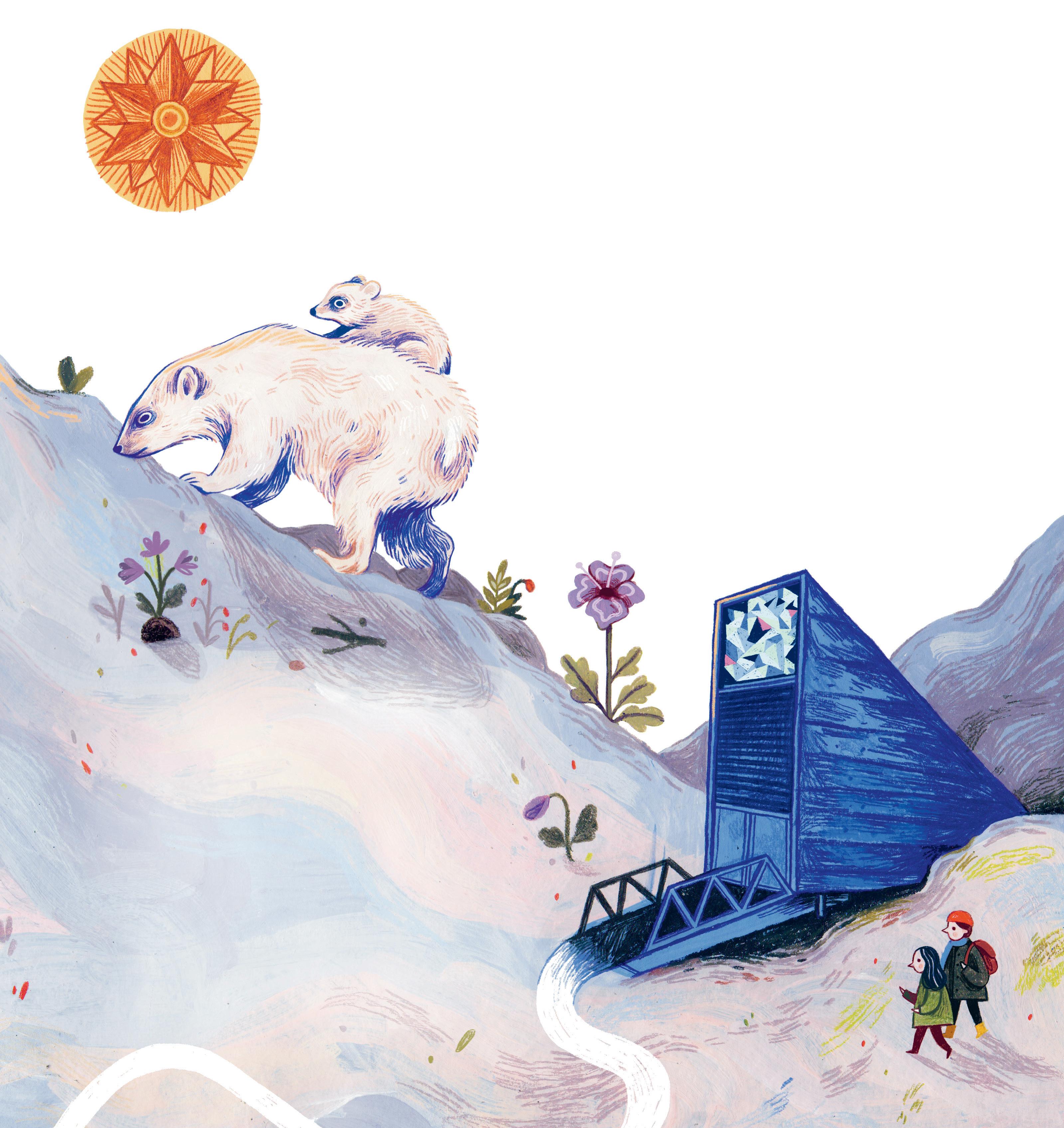The old mine is now the Global Seed Vault, a huge freezer containing seeds from more than a million plants. There’s no electricity there – the icy mountain itself keeps it cold. It’s the biggest vault of its kind in the world! We once went on a school trip there and saw rows of shelves filled with lots of sealed black boxes. We got to see inside a box that was being put there for storage. Inside were a hundred carefully labelled silver pouches filled with seeds from Burundi. I bet my besteforeldre would have been amazed by the vault.