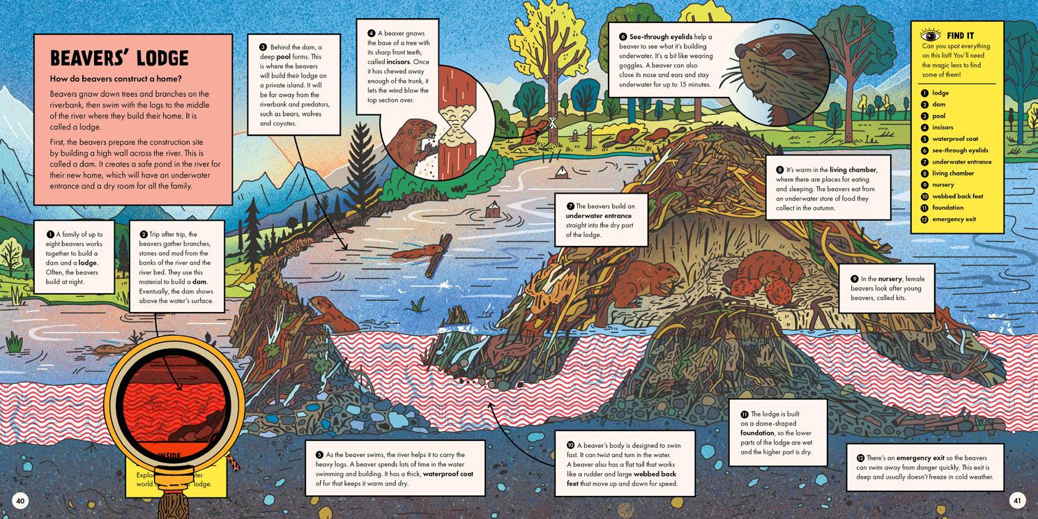 An exclusive invitation into your favourite animals’ homes! Use the magic lens to see through, peek behind and tunnel deep into bear dens, armadillo burrows, beehives, squirrel dreys and more.
