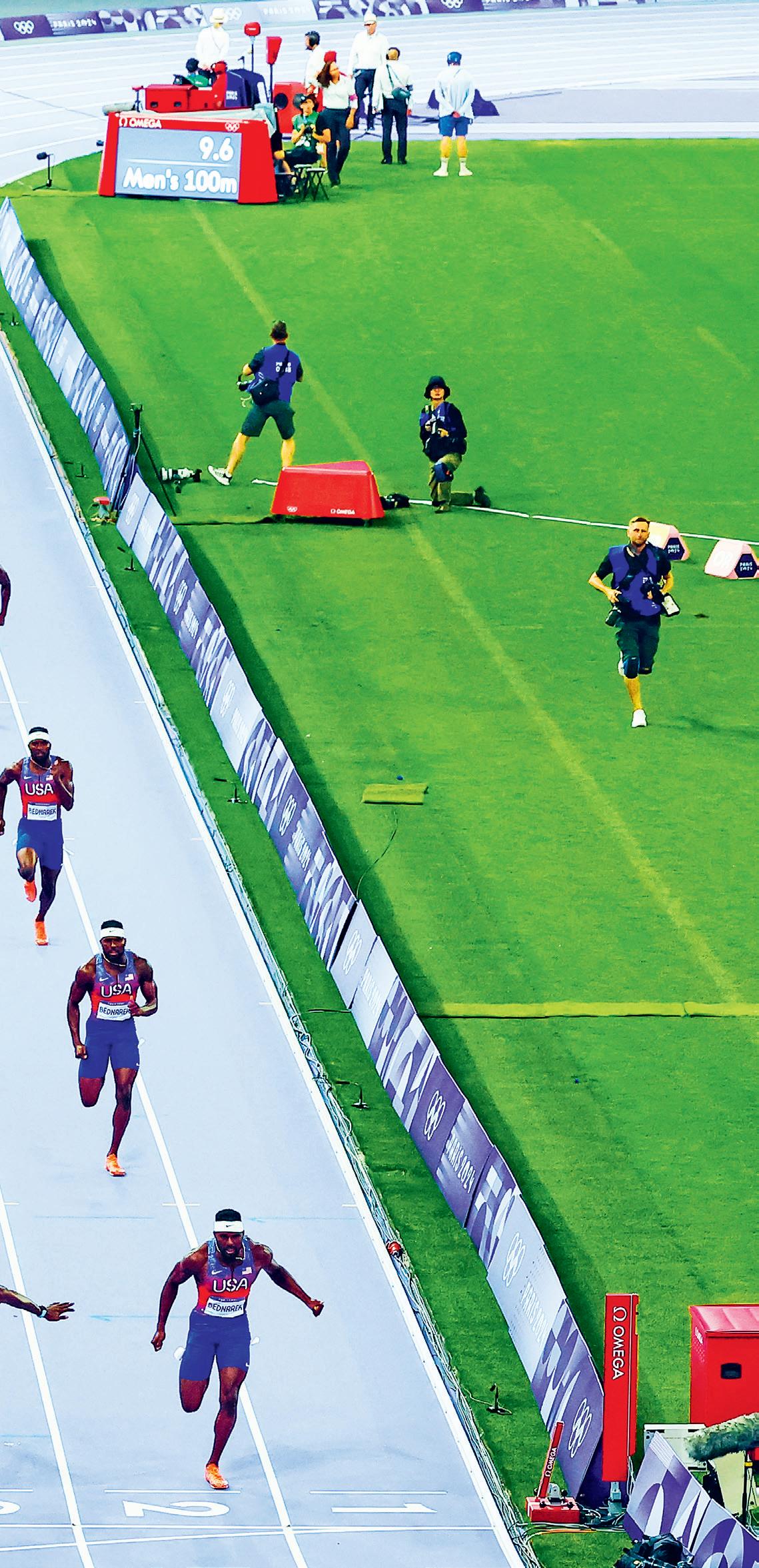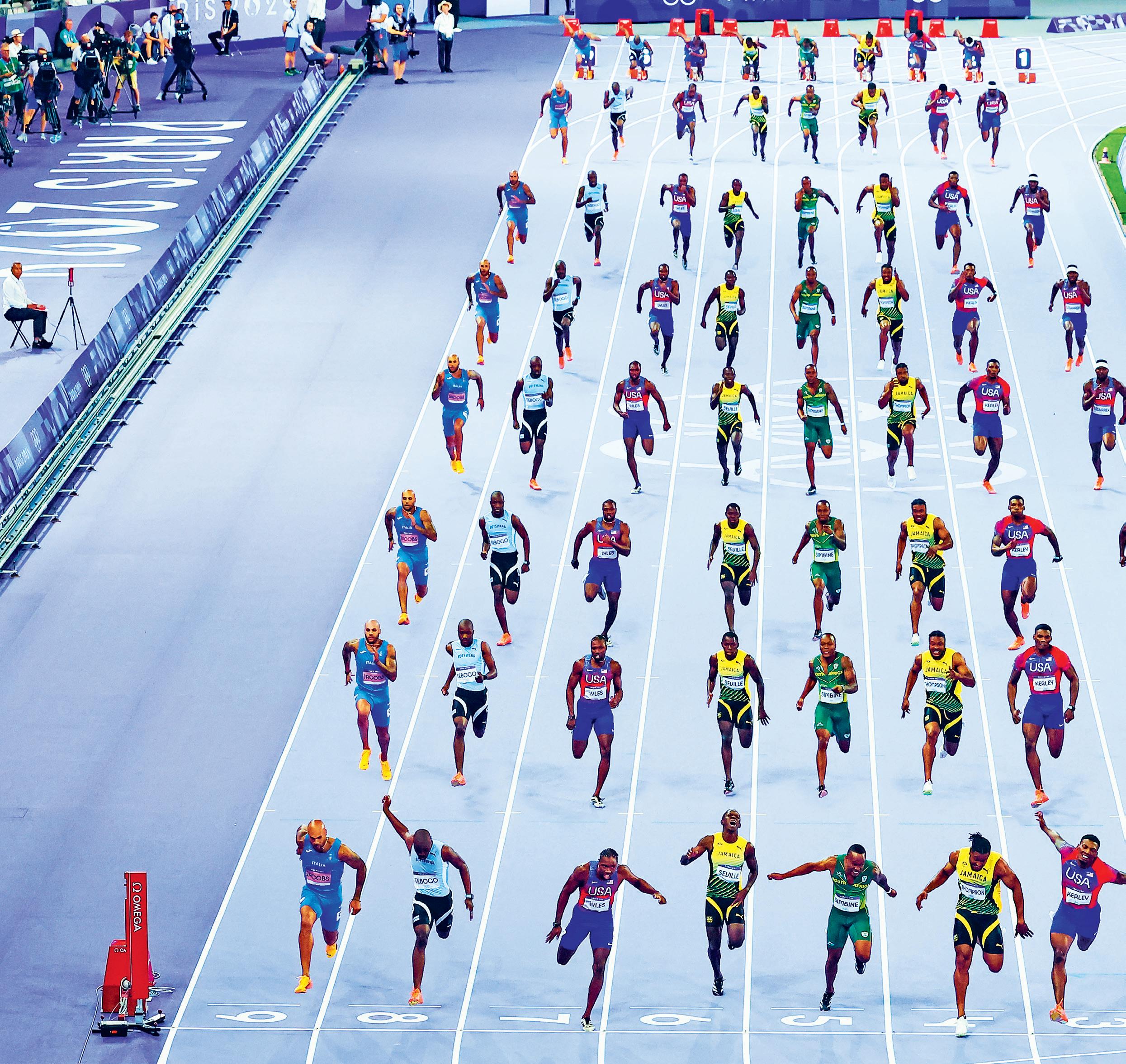 This amazing picture is what is called a composite, which means it’s a collection of photos put together. It was taken during the men’s 100m final during the Olympic Games in Paris in 2024. Combining many images allows you to relive the whole super-speedy event all at once, without missing a beat!