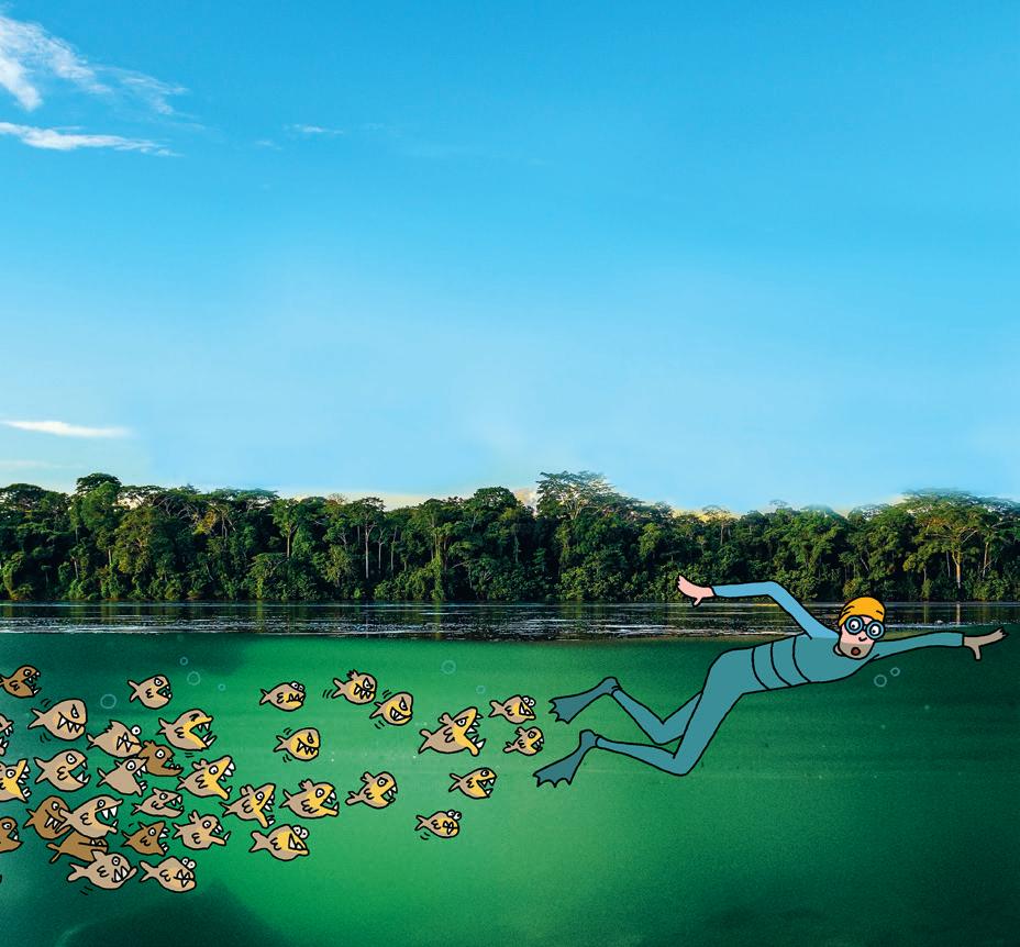 A red-bellied piranha gets most of its food by nipping at the tails of larger fish in South American rivers