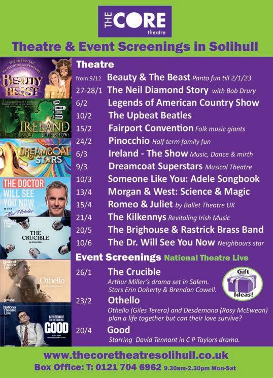Managing Director: Davina Evans davina@whatsonlive.co.uk 01743 281708 Sales & Marketing: Chris Horton chris@whatsonlive.co.uk 01743 281704 Editorial: Lauren Foster lauren@whatsonlive.co.uk 01743 281707 : Brian O’Faolain brian@whatsonlive.co.uk 01743 281701 : Abi Whitehouse abi@whatsonlive.co.uk Subscriptions: subscriptions@whatsonlive.co.uk 01743 281714 Contributors: Graham Bostock, Katherine Ewing, Diane Parkes, Patsy Moss, Steve Adams, Steve Taylor, Sue Hull, Sue Jones Publisher and CEO: Martin Monahan Accounts Administrator: Julia Perry julia@21stcd.com 01743 281717 This publication is printed on paper from a sustainable source and is produced without the use of elemental chlorine. We endorse the recycling of our magazine and would encourage you to pass it on to others to read when you have finished with it. All works appearing in this publication are copyright. It is to be assumed that the copyright for material rests with the magazine unless otherwise stated. No part of this publication may be reproduced, or stored in an electronic system, transmitted in any form or by any means, electronic, mechanical, photocopied, recording or otherwise, without the prior knowledge and consent of the publishers. What’sOn December 2022 CONTENTS MEDIA GROUP What’sOn Follow us at: whatsonwarwickshire whatsonworcestershire @whatsonwarwicks @whatsonworcs @whatsonwarwicks @whatsonworcs 04 10 13 17 39 43 49 19 29 32 35 37 INSIDE: First Word 4 Theatre 22 Dance 35 Film 37 Visual Arts 42 Gigs 17 Events 45 Comedy 19 Food 13