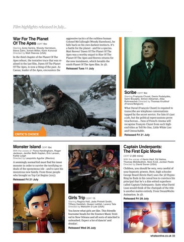 Film highlights released in July... War For The Planet Of The Apes CERT tbc Starring Andy Serkis, Woody Harrelson, Steve Zahn, Amiah Miller, Karin Konoval Directed by Matt Reeves (USA)