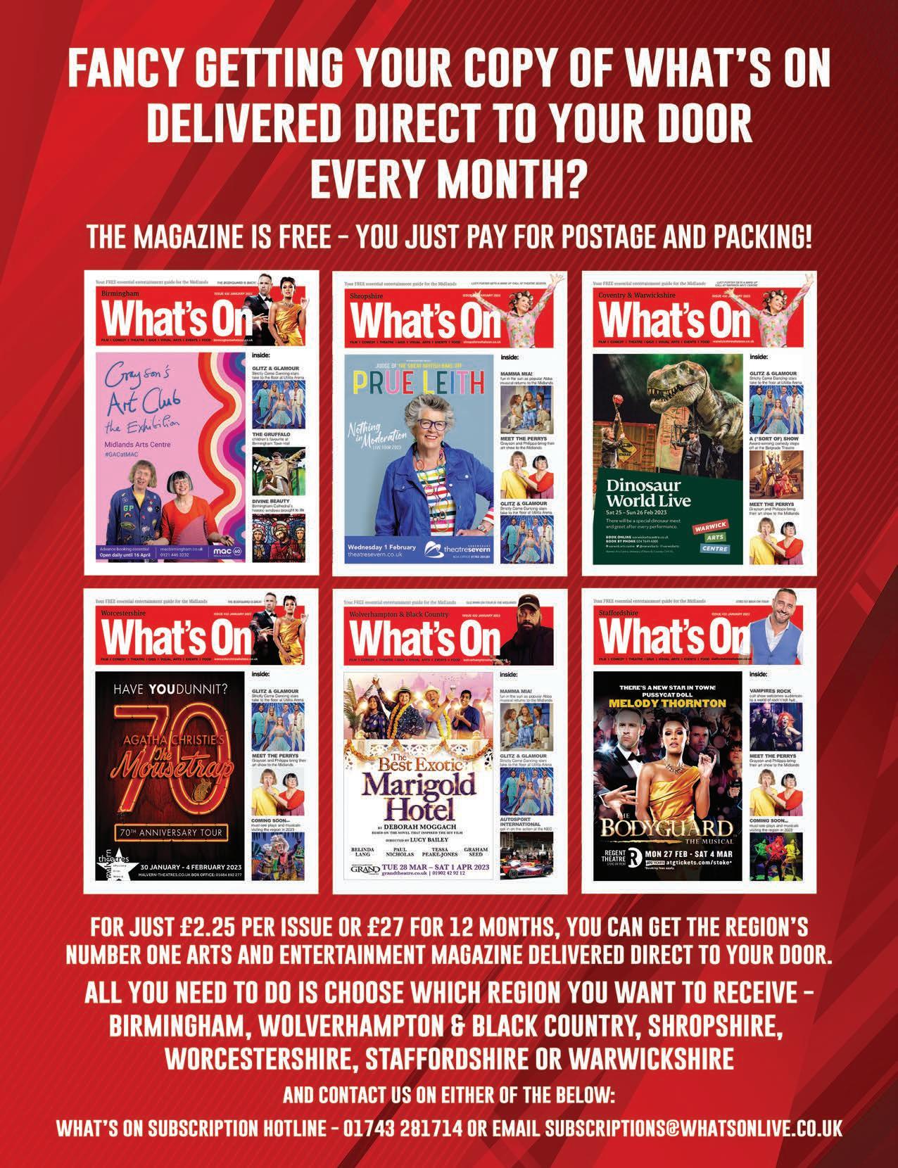 Lichfield regular Sam Rabone is joined by Brian Wheeler (Star Wars) and Dean Whatton (Game Of Thrones) in this festive family favourite, until Sun 8 Jan, Lichfield Garrick CINDERELLA Festive family favourite, complete with sparkling sets, singalong songs and laughs aplenty, until Sun 8 Jan, The Albany Theatre, Coventry ALADDIN Starring Louie Spence as the Spirit of the Ring, Jamie Kenna as Abanazar, Kiera-Nicole as Jasmine and ‘Crewe’s treasured dame’, Malcolm Lord, as Widow Twankey, until Sun 8 Jan, Crewe Lyceum Theatre BEAUTY AND THE BEAST Featuring: ‘legendary Dame’ Brad Fitt; Tommy J Rollason (Britain’s Got Talent); Samantha Dorrance (Disney Channel); Jo Osmond (The Mandalorian); and Kane Oliver Parry (Matilda, West End), until Sun 8 Jan, Theatre Severn, Shrewsbury ALICE IN WONDERLAND Lewis Carroll’s much-loved classic, until Sat 28 Jan, New Vic Theatre, Newcastle-underLyme DICK WHITTINGTON Lavish pantomime featuring Marti Pellow, Matt Slack, Dr Ranj, Suzanne Shaw, Doreen Tipton and Andrew Ryan, until Sun 29 Jan, Birmingham Hippodrome ALADDIN Fun-filled family panto featuring toe-tapping tunes from the likes of Dolly Parton, Prince, and Disney’s smash-hit musical, Newsies, Thurs 5 - Sun 8 Jan, Warwick Arts Centre, Coventry