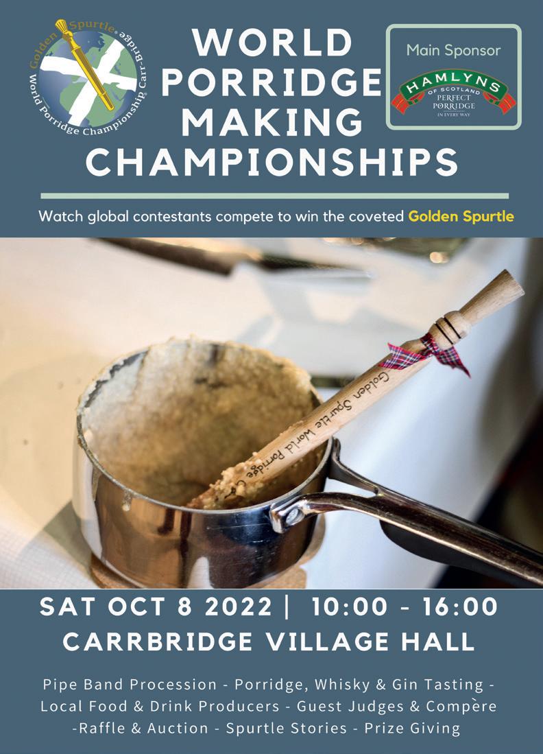 FREE. Golden Spurtle World Porridge Making Championship - Carrbridge Village Hall, Main Street, Carrbridge. 9.45am-4.45pm. T: 01479 841385. www.goldenspurtle.com. Aviemore Half Marathon - Badaguish Outdoor Centre, Glenmore, Aviemore. 11am. T: 01479 861285. badaguishoutdoorcentre.org.
