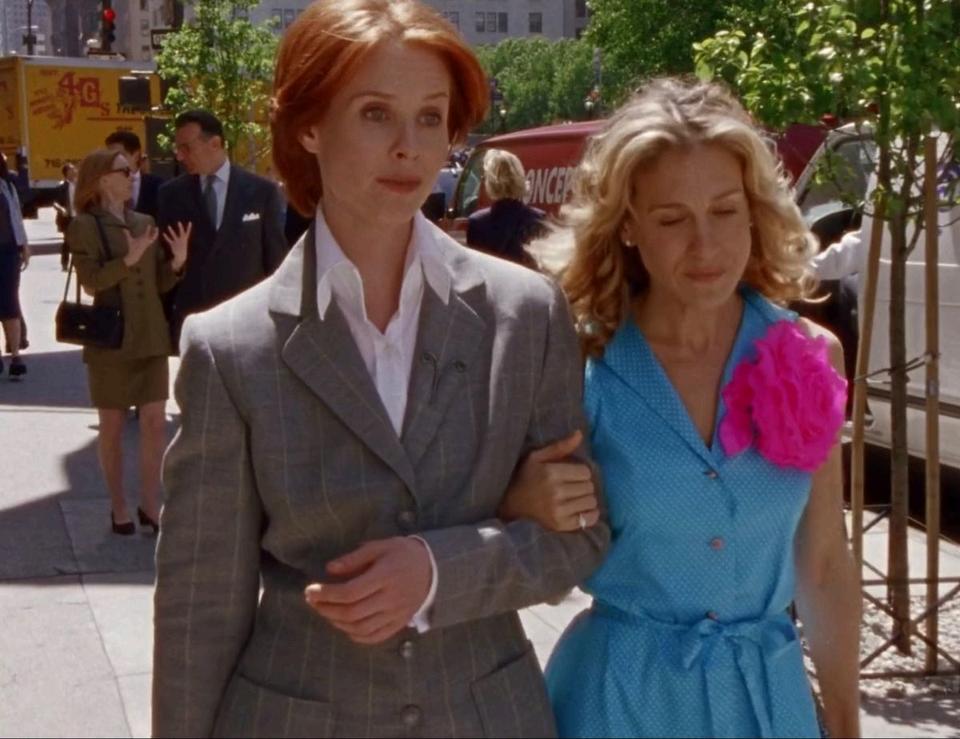 Miranda Hobbes, by contrast, represents what is in many ways the opposite of this. Her ambition is filtered through androgyny. Her wardrobe echoes the 1980s power suit, built on the premise that women must downplay femininity to succeed in male-dominated spaces. What’s striking is that Miranda’s ambition and competence are often framed as unlikable, and her less “fashionable” approach is depicted as joyless. The costuming reinforces the double standard that dressing with authority grants you power, but it simultaneously codes you as cold or unfeminine. Today, much like in the style of Miranda, oversized tailoring and gender neutral cuts exist as central trends within workplace fashion.