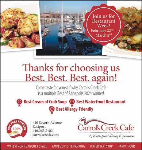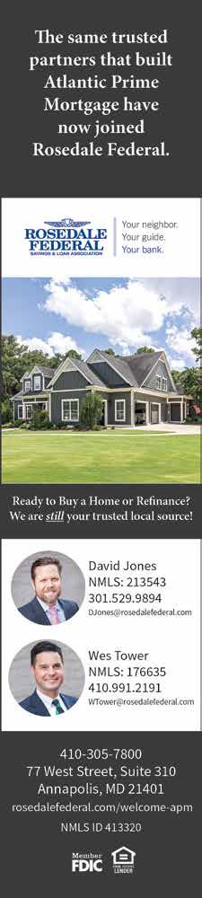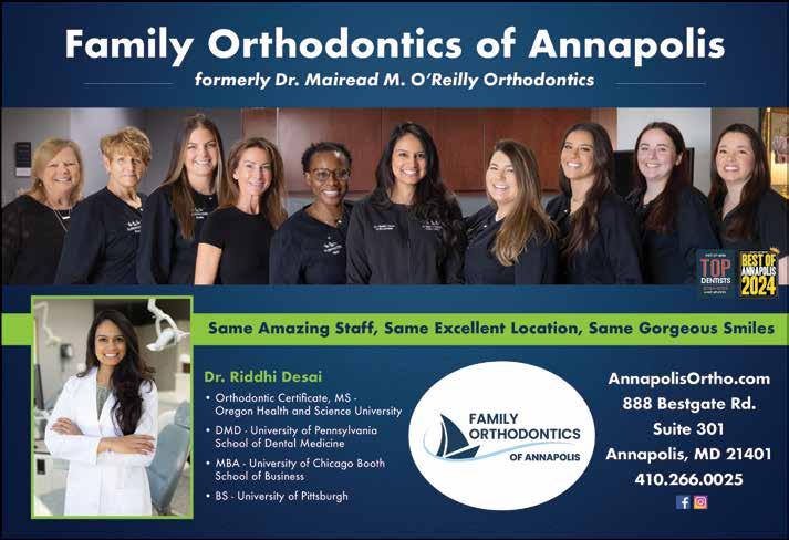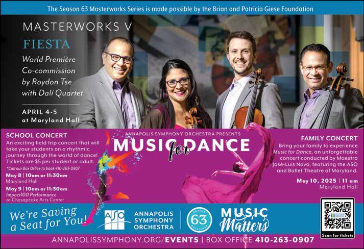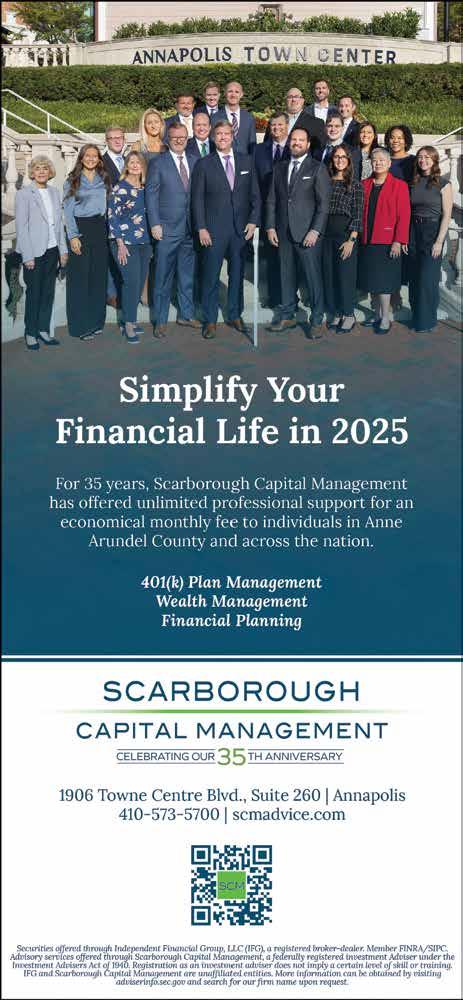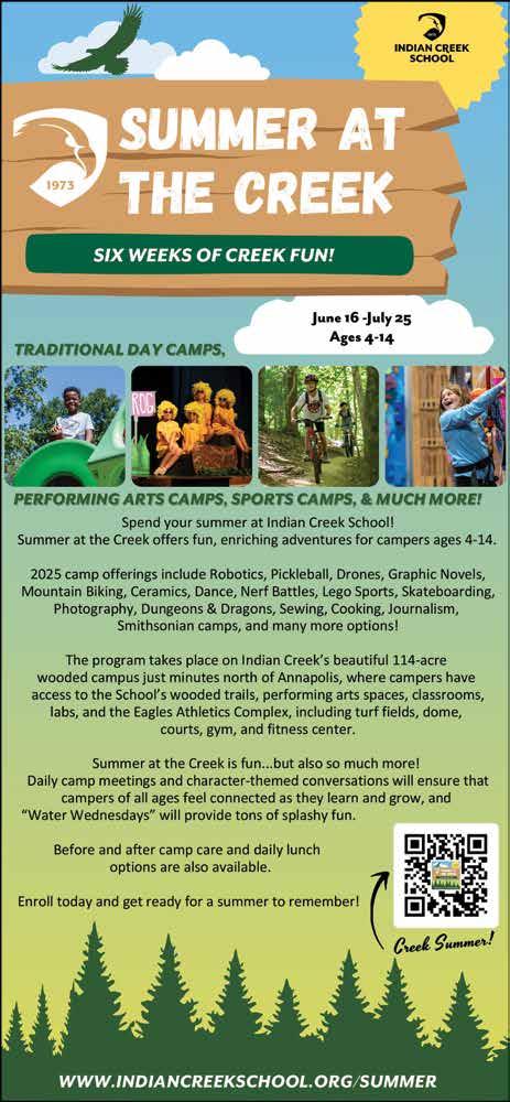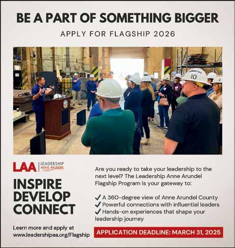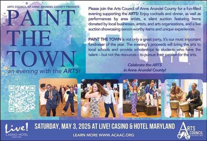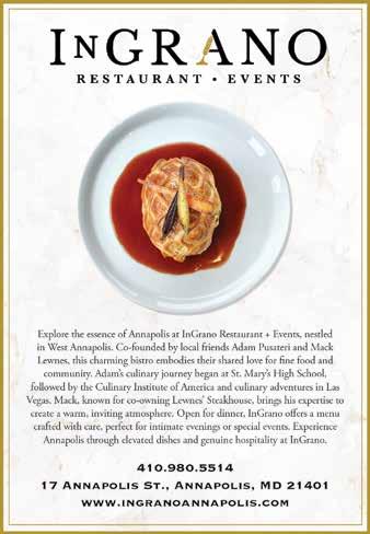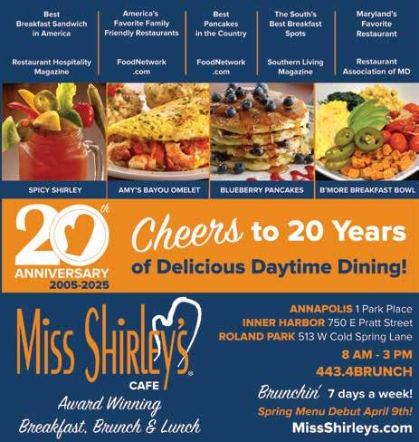 Media 900 Bestgate Road, Ste. 202, Annapolis, MD 21401, 410-266-6287. No part of this magazine may be reproduced in any form without express written consent of the publisher. Publisher disclaims any and all responsibility for omissions and errors. All rights reserved. Total printed circulation is 44,582 copies with an estimated readership of 160,045. ©2025 What’s Up? Media. Home Grown, Locally Owned: This issue of What’s Up? Annapolis employs more than 25 local residents.