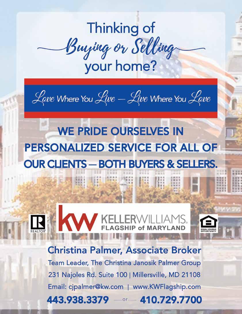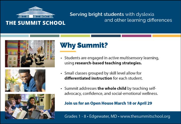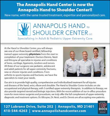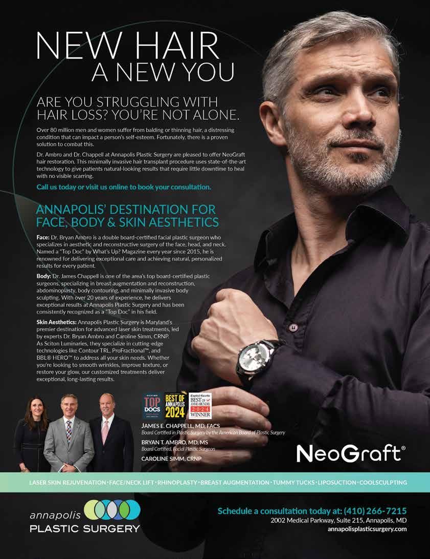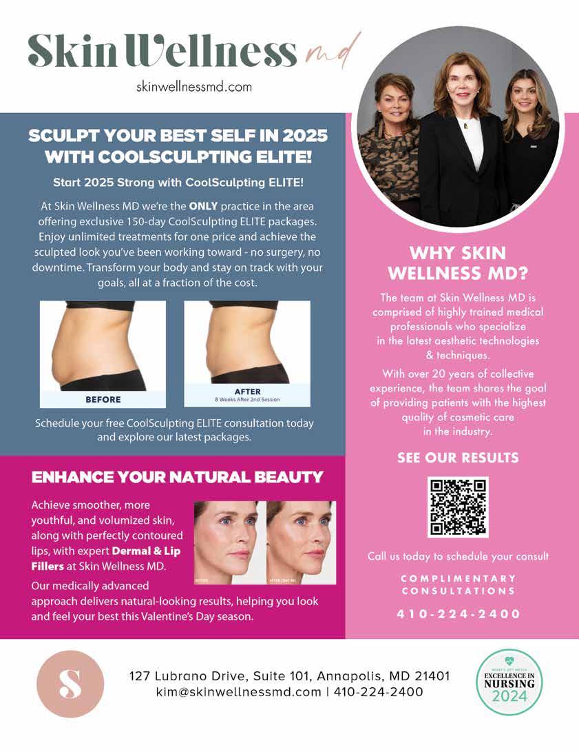 Media 900 Bestgate Road, Ste. 202, Annapolis, MD 21401, 410-266-6287. No part of this magazine may be reproduced in any form without express written consent of the publisher. Publisher disclaims any and all responsibility for omissions and errors. All rights reserved. Total printed circulation is 44,582 copies with an estimated readership of 160,045. ©2025 What’s Up? Media. Home Grown, Locally Owned: This issue of What’s Up? Annapolis employs more than 25 local residents.