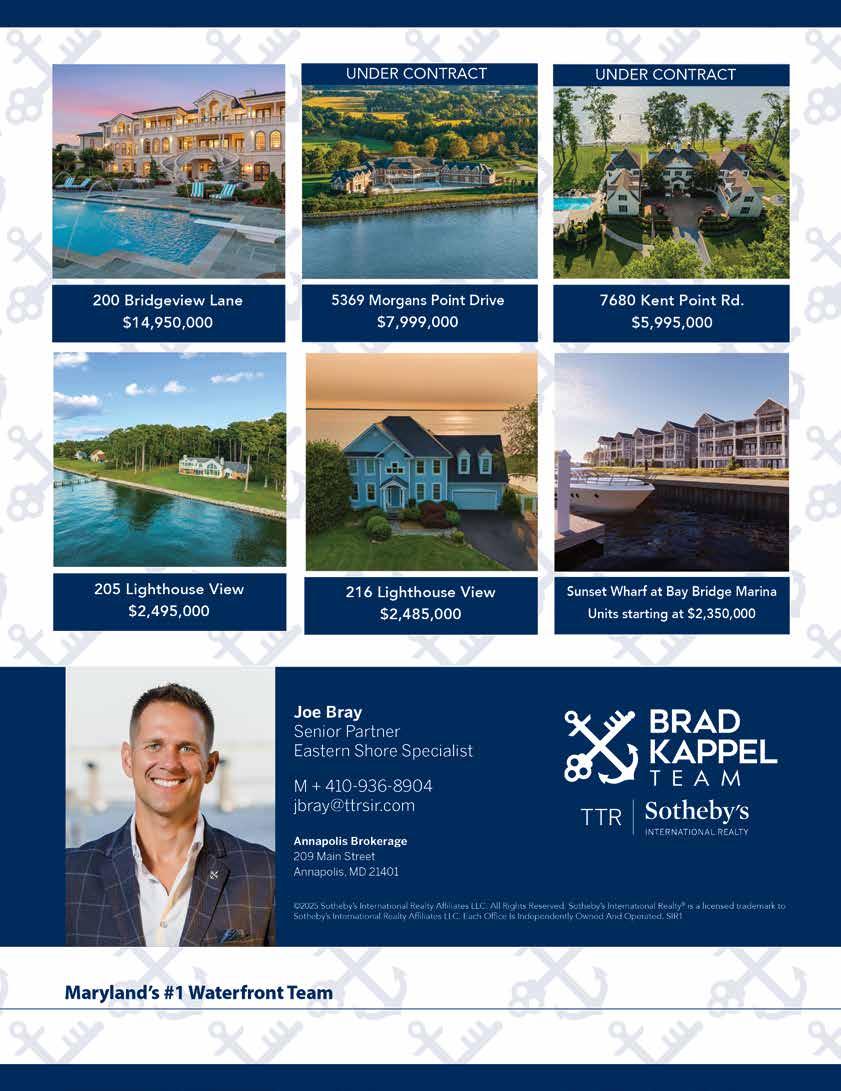 Listing Agent: Laura Carney, TTR Sotheby’s International Realty, 17 Goldsborough St., Easton, m. 410-3103307, o. 410-673-3344, lcarney@ttrsir. com, sothebysrealty.com Buyers’ Agent: Cornelia C. Heckenbach, Long & Foster Real Estate, 109 S. Talbot St., St. Michaels, m. 410-310-1229, o. 410745-0283, info@corneliaheckenbach. com, stmichaelsmdwaterfront.com