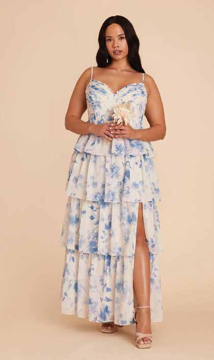 Tiered ruffles and the watercolor print come together to create a romantic garden-inspired dress.