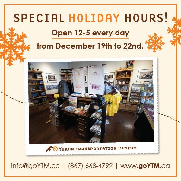 GET AWAY TO BEAUTIFUL ATLIN FOR THE NEW YEAR and celebrate in style. LOBSTER DINNER 2 sittings 6pm and 7:30pm ROCK AND ROLL BAND late-night lunch after the FIREWORKS. Wake up late and enjoy a New Year’s BRUNCH OFFERING MIMOSAS CALL NOW TO BOOK YOUR TICKETS. Hotel rooms available. Gifts Big & Small For One and All Yukon Inn Plaza 393-3984 MON - SAT: 9:30AM - 6PM | SUN: 11AM - 4PM Your One Stop Christmas Shop