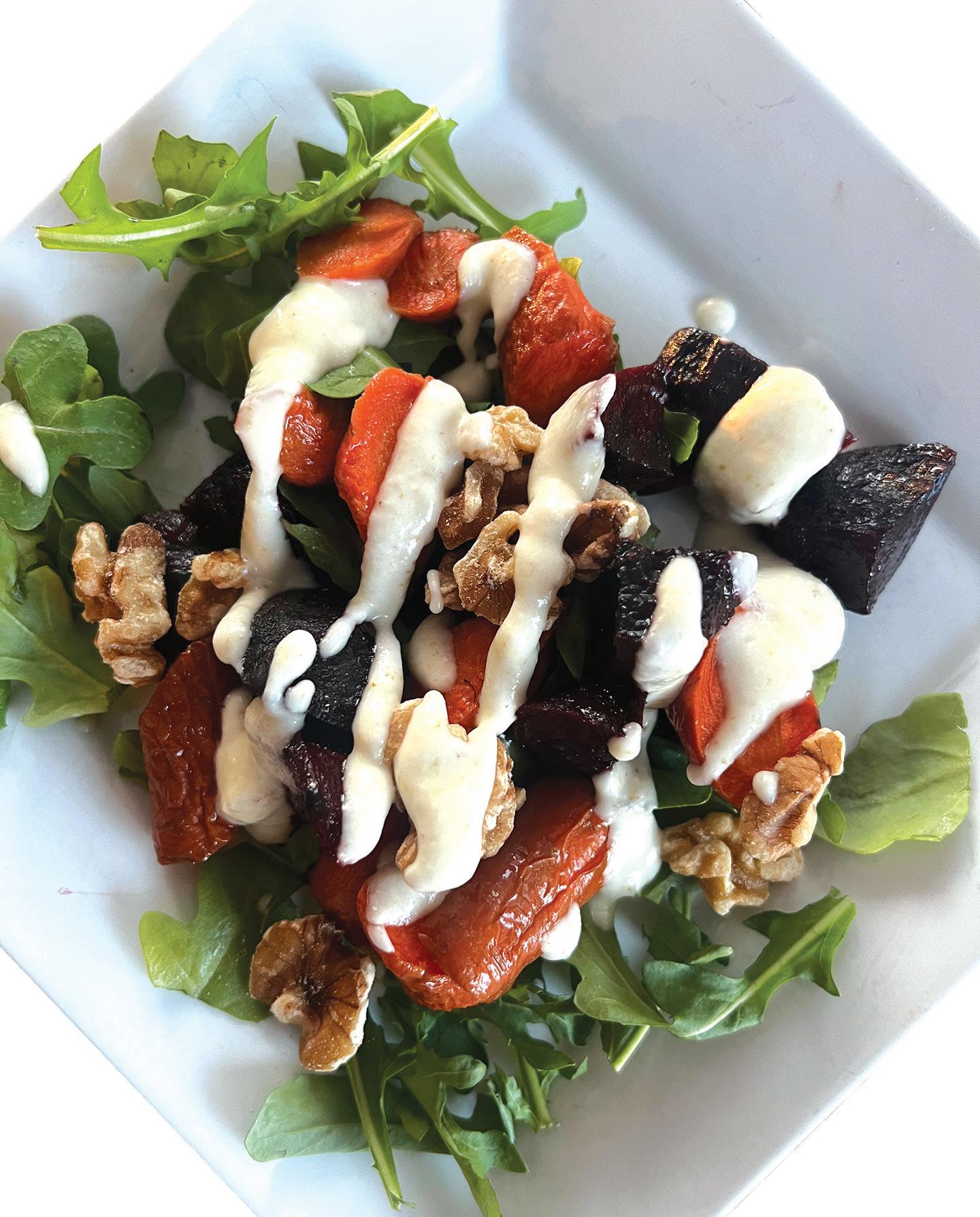 When I was asked to write a recipe for this issue of What’s Up Yukon, I decided to call in a real expert and asked local dietician and dreamboat Anna Ly (@fueled.by.Anna, www.fueledbyanna.com) for her advice on taking the world’s greatest poop. Topping fresh baby arugula with roasted beets and carrots, then drizzling them with a dressing made from a fibrefilled combination of pears and hemp hearts doubles down on nutritional value. Topping the salad, with nuts, adds some protein and crunch and makes this a “buttfriendly” salad that’s easy to take to work or serve alongside a piece of roasted meat or fish.