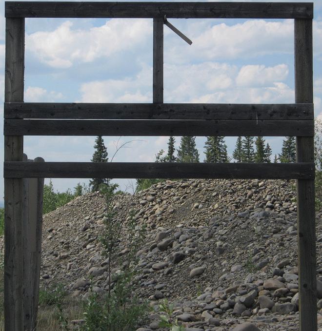 On the wormtrail of the tailings, rusted machinery; a memory of dredges and cats combined. On the gravel below a Parks Canada sign offers an explanation, while two cables offer support to a power pole. All this is framed by an empty sign that once offered support to a business, and now provides a glimpse into the past which supports our future.