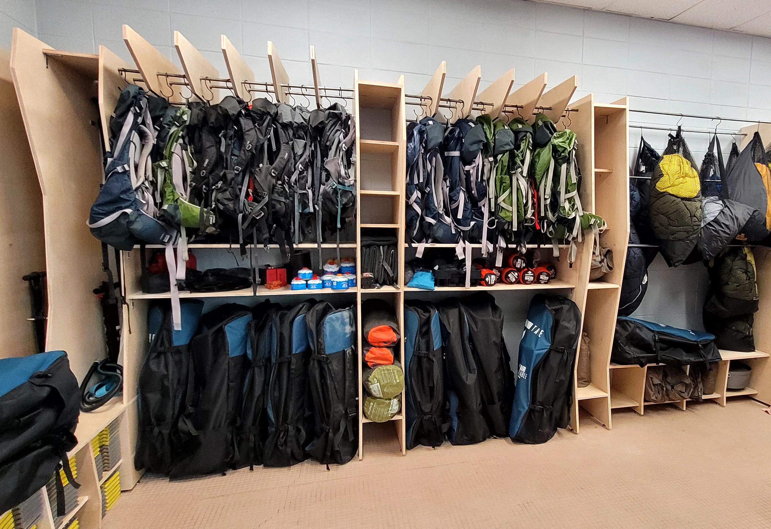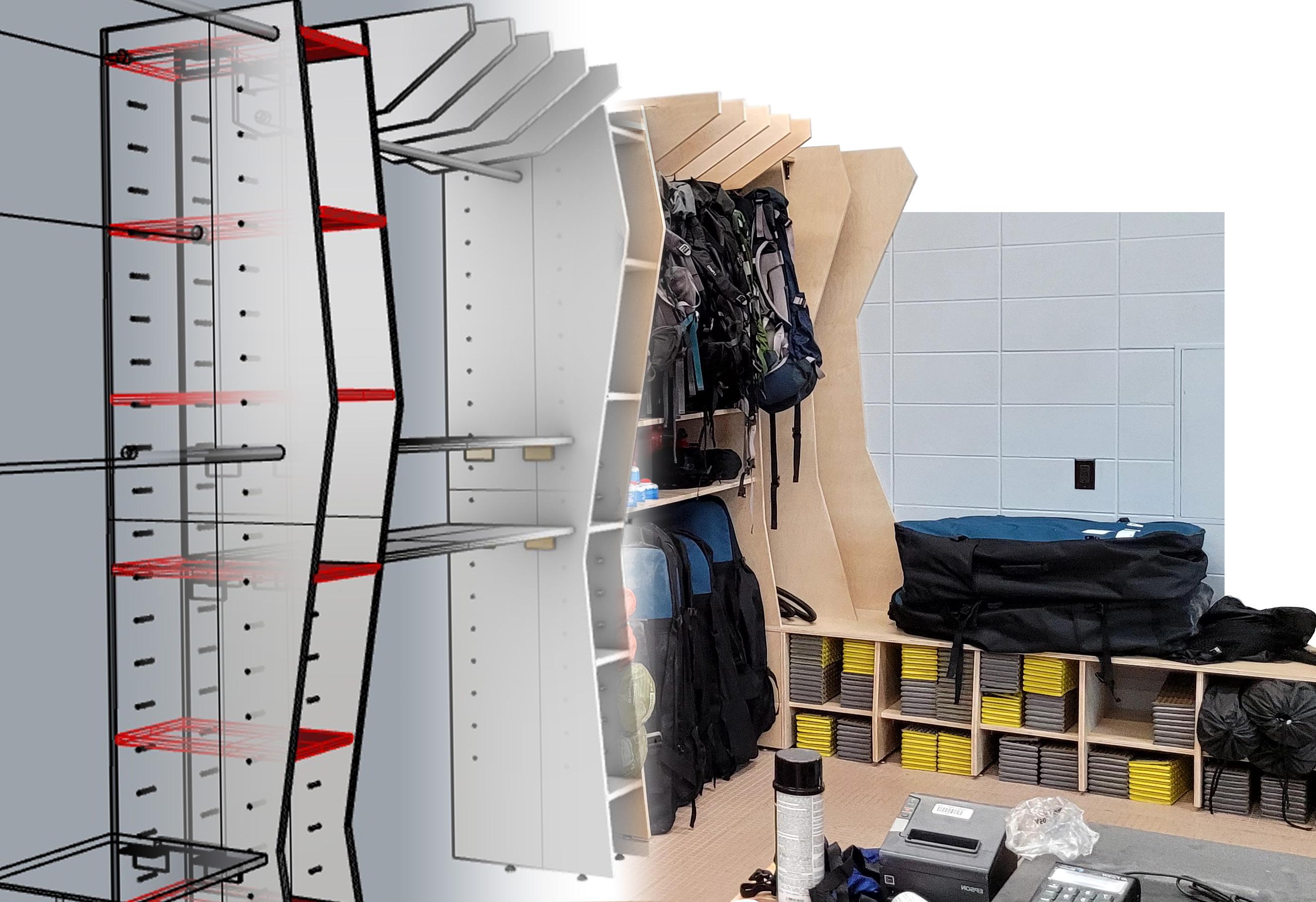 The project’s aim was the bring the dreary storage room for the Outdoor Adventures student camping club to life with an interesting design that utilizes CAD conceptualization and CNC milling fabrication techniques.