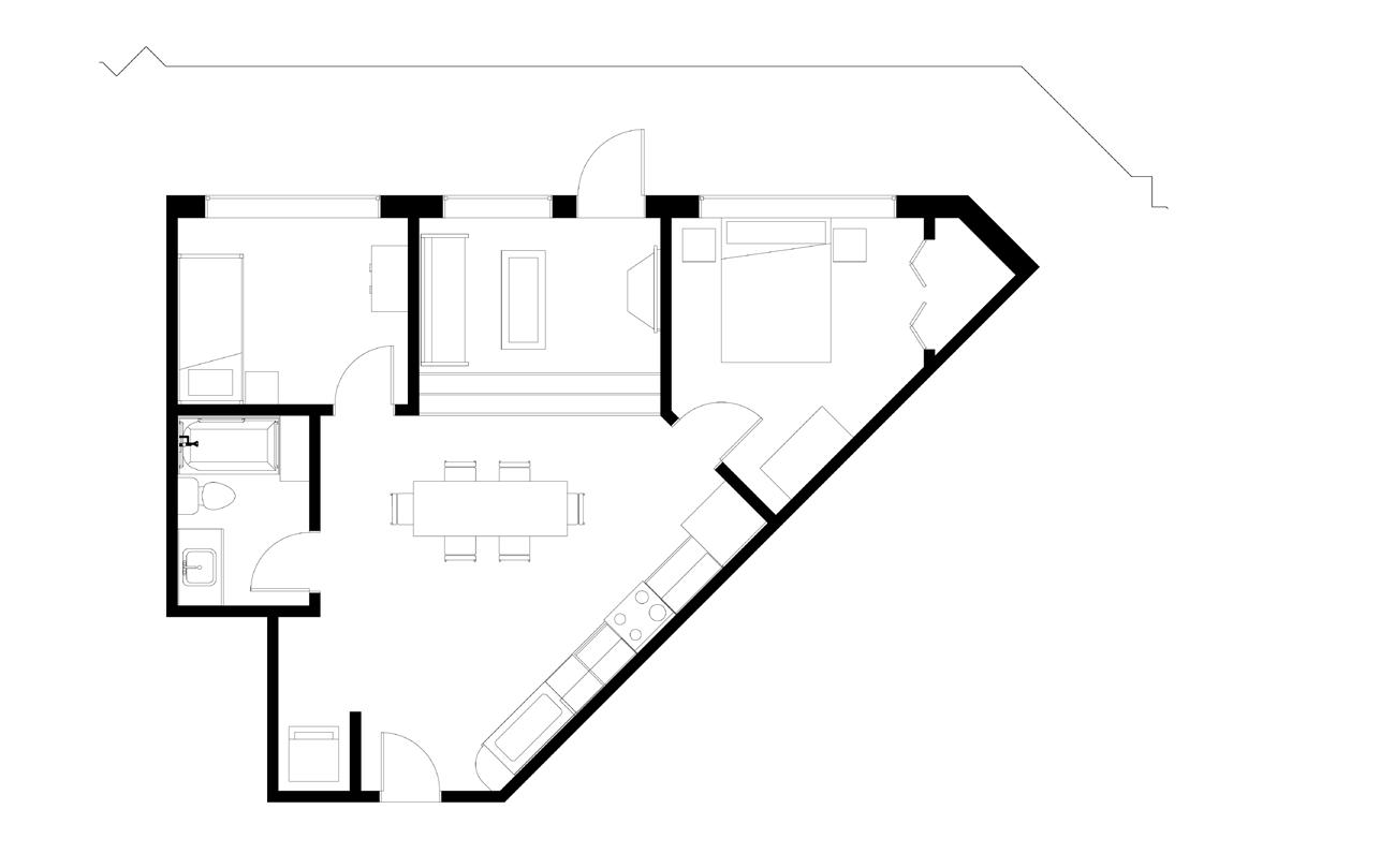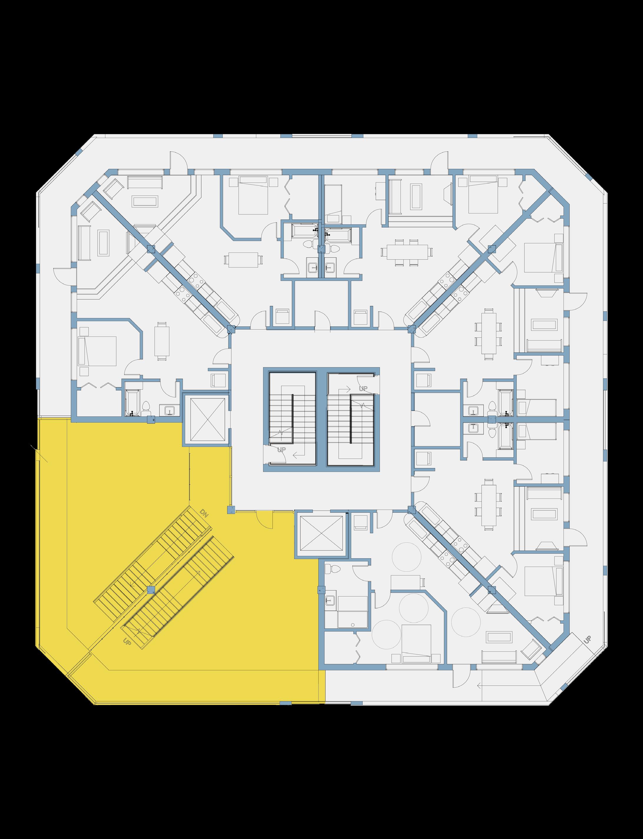 The units are tessellated on the floor plan in a manner that maximizes an unobstructed panoramic view of the urban horizon for all residents.