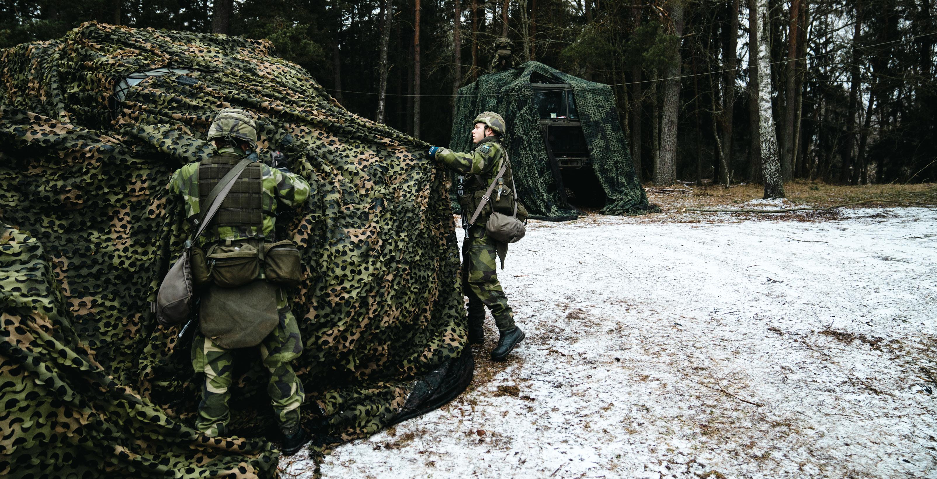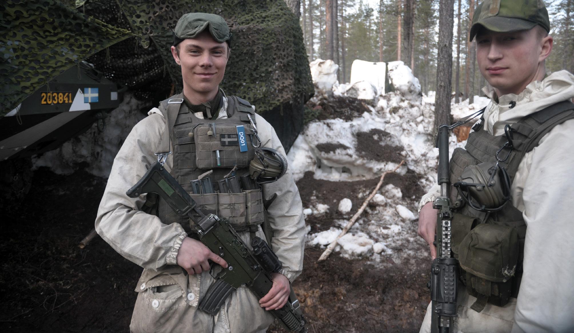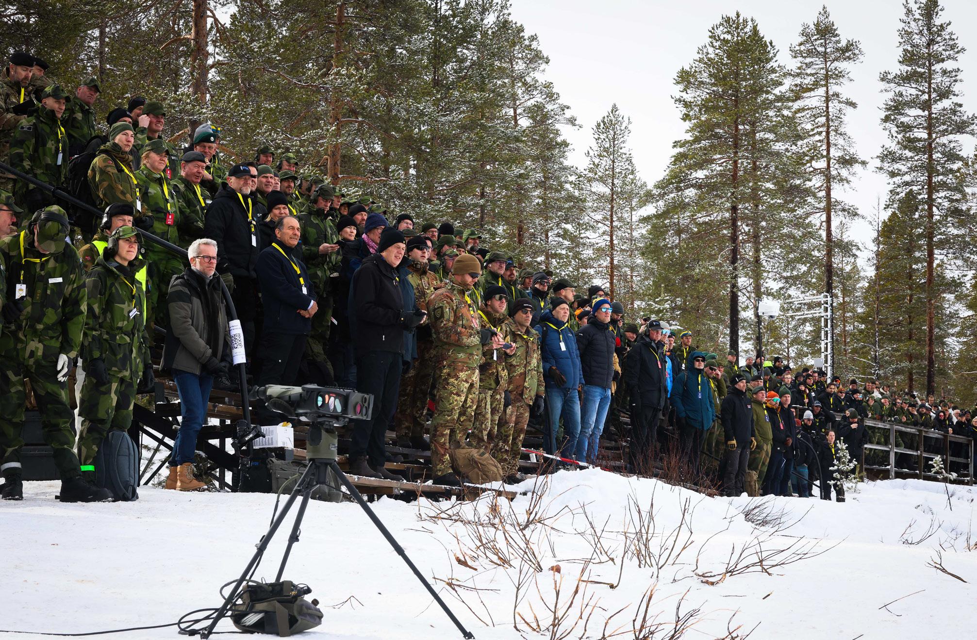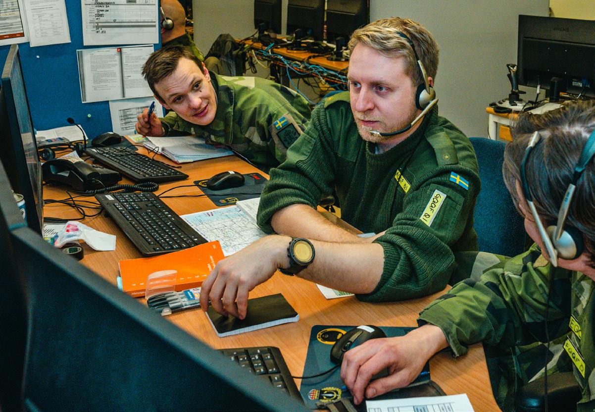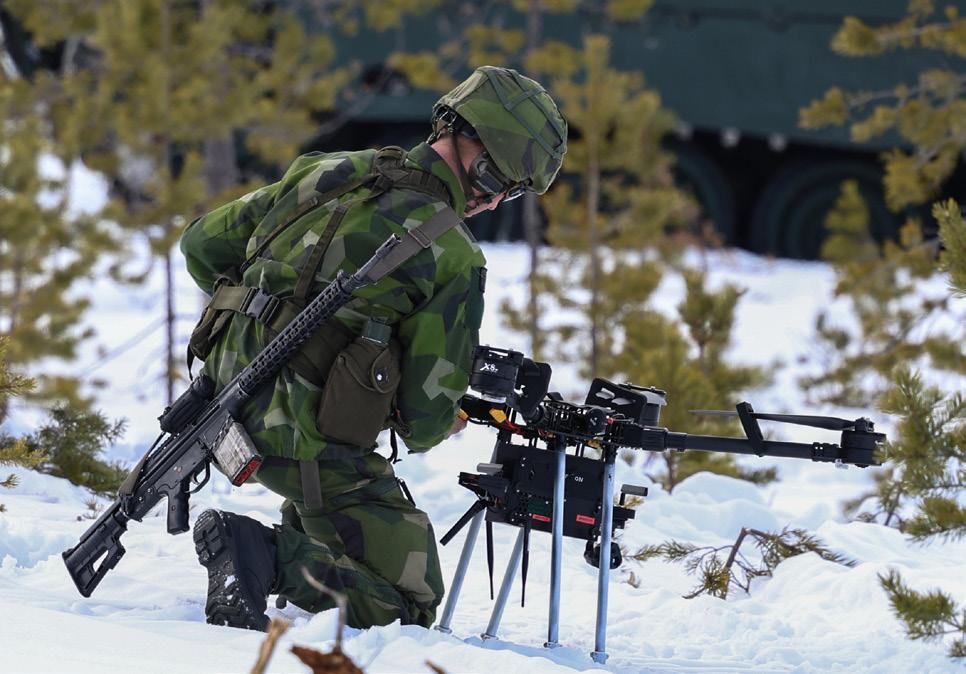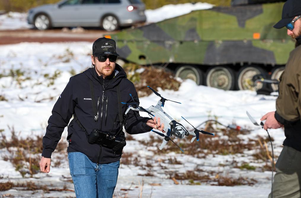 Omslagsbild: Två drönaroperatörer från ett av de medverkande industriföretagen, i samband med årets experiment- och demonstrationsövning Arctic Strike 25, på väg att skicka iväg en drönarsvärm, då indirekt bekämpning med stöd av spaningsdrönare som verktyg, var ett av de momenten som presenterades för åskådarna. Foto: David Hakeberg, Bodens artilleriregemente.