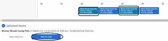 Select the dates the camper will be attending. All selected options will pop up at the bottom of the screen. Once you finish selecting all days for that camp, click on “Add to Cart” at the bottom of the screen.
