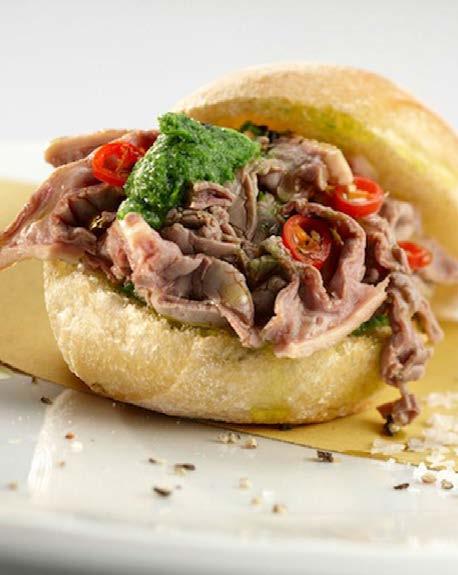 LAMPREDOTTO This is Florentine street food par excellence. But watch out, it’s not for weak stomachs. Actually it’s a cow’s fourth stomach, known as the ’abomaso’, cooked in a herb broth and most commonly served in a panino soaked in the broth or topped with the local parsleybased green sauce. Historically a poor man’s dish, it is still very popular in Florence today thanks to the numerous open-air kiosks known as “lampredottai”, doing a roaring trade with Florentines as well as tourists who can’t wait to try this speciality, accompanied by the obligatory glass of wine.