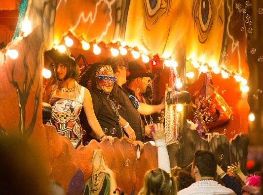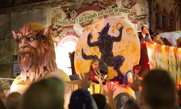 sight to behold. Over 40 marching groups now participate in the parade and Brian works hard to ensure the throws are of the highest quality ranging from glow in the dark beads to Halloween-themed Peeps. “The goal is to throw a lot of nice things, so when you catch them, you want them.”