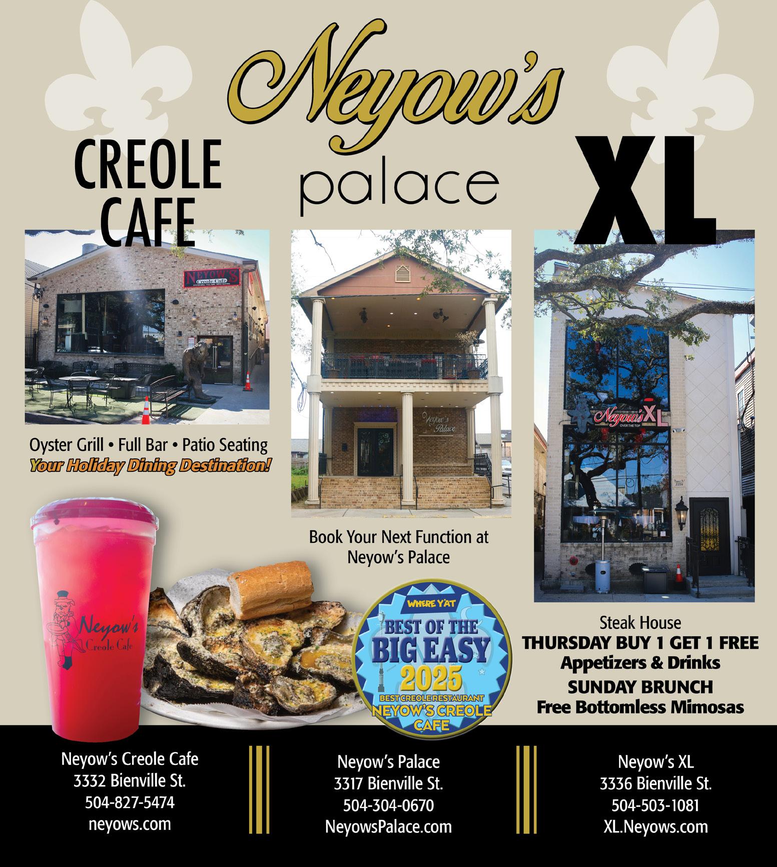 Neyow’s XL is a sleek, upscale extension of Neyow’s Creole Café, offering prime steaks, seafood, and rich Creole sides. Expect extravagant and delicious dishes such as crawfish mac and cheese, whole red snapper, and buttery ribeye with polished service. 3336 Bienville St., (504) 503-1081, xl.neyows. com
