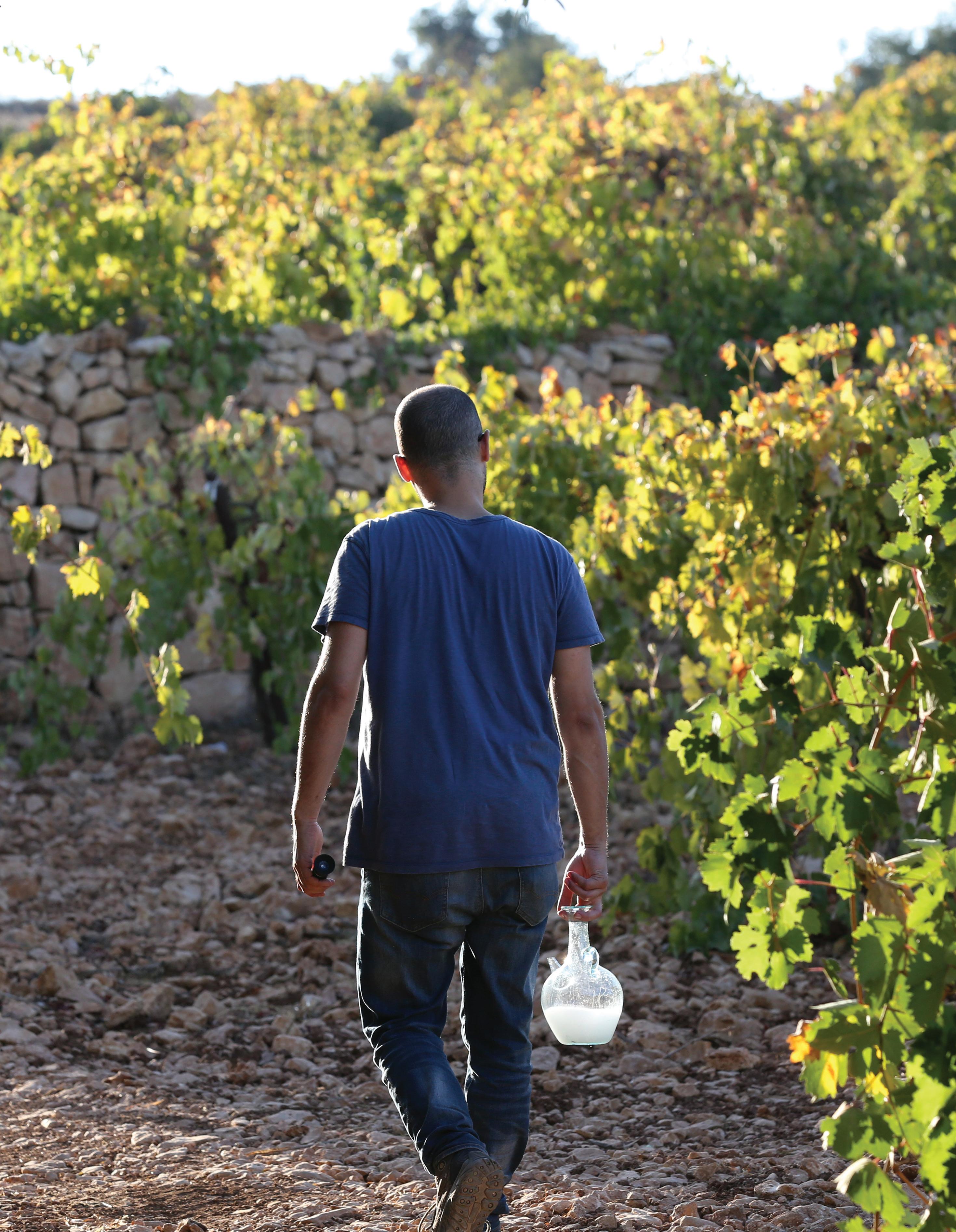 Nader Muaddi checks on the grapes before the harvest for his arak production. West Bank, September 2019. Photo: Lyric Lewin