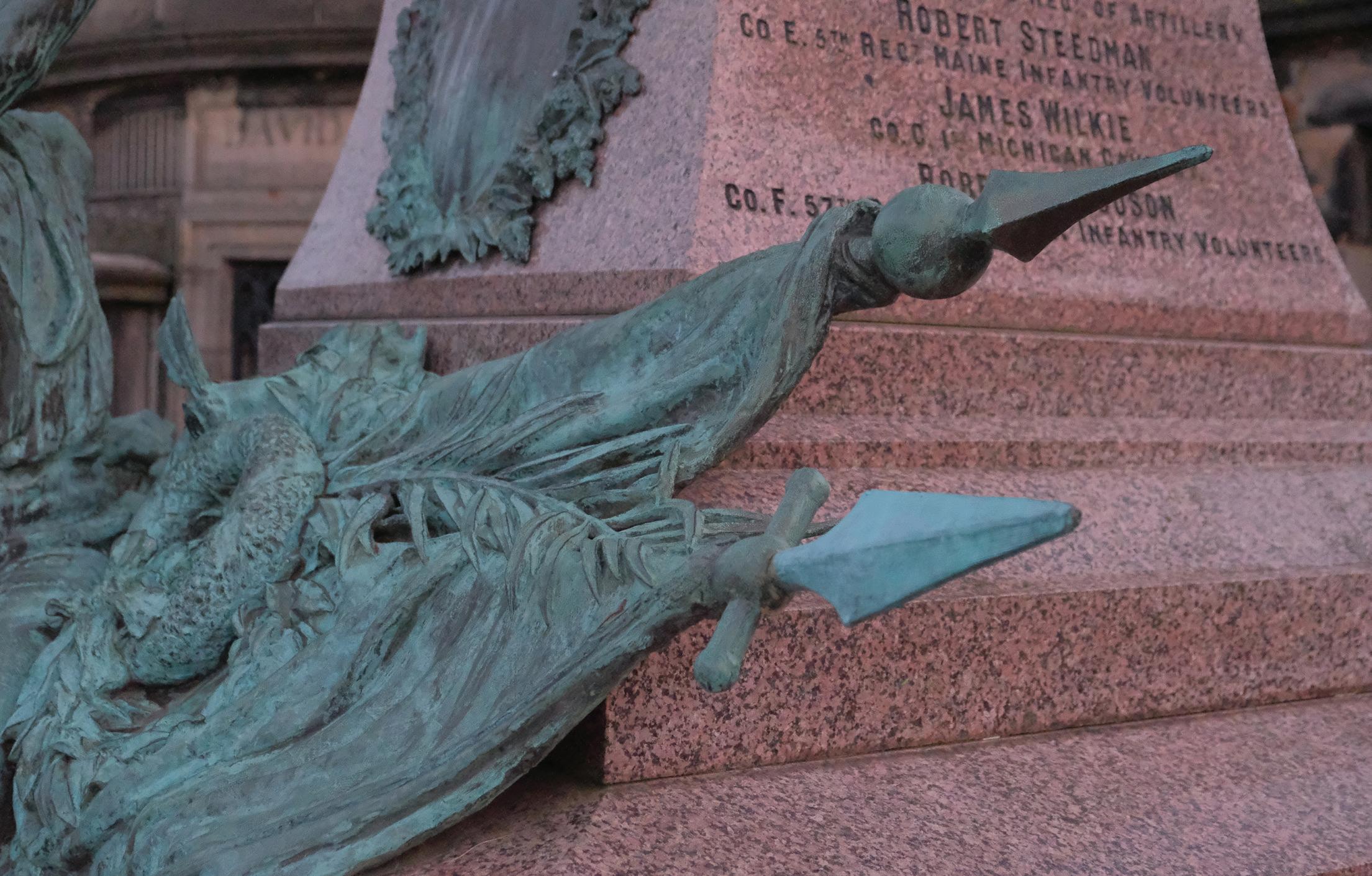 The tip of the spear, once missing from the weapon at the base of the Scottish-American Soldiers Monument, was restored and returned to the statue in 2022.