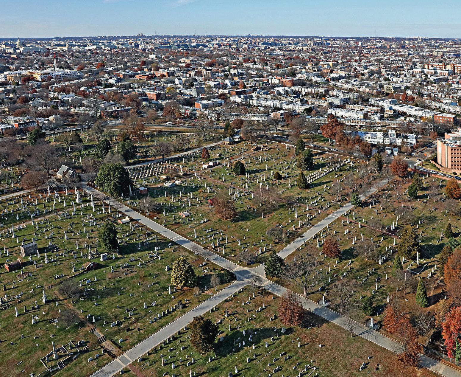 The U.S. Capitol Building is seen in the distance at top left in this aerial view of Congressional Cemetery looking northwest over blocks of residential, commercial, and government buildings.