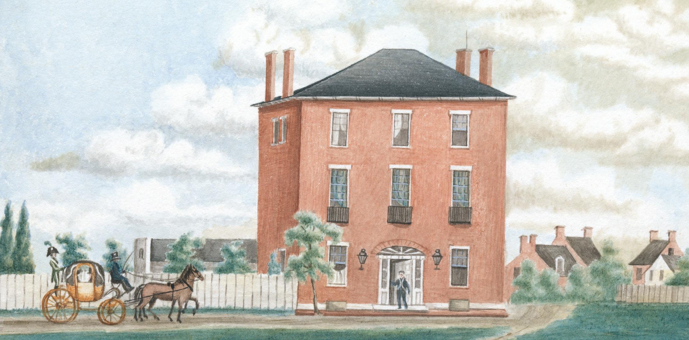 This watercolor made by Eugène Vaile in 1822 depicts visitors arriving at Stephen Decatur’s house by carriage as they would have the evening he welcomed society to a wedding reception for President Monroe’s youngest daughter.