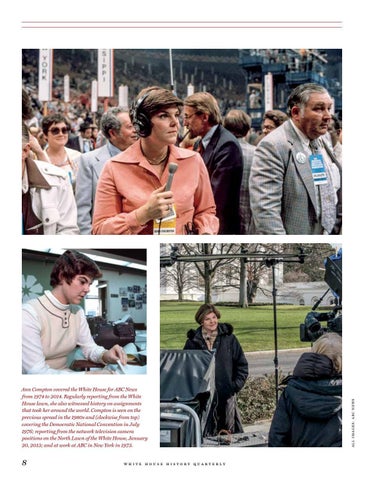 Ann Compton covered the White House for ABC News from 1974 to 2014. Regularly reporting from the White House lawn, she also witnessed history on assignments that took her around the world. Compton is seen on the previous spread in the 1980s and (clockwise from top) covering the Democratic National Convention in July 1976; reporting from the network television camera positions on the North Lawn of the White House, January 20, 2013; and at work at ABC in New York in 1973.