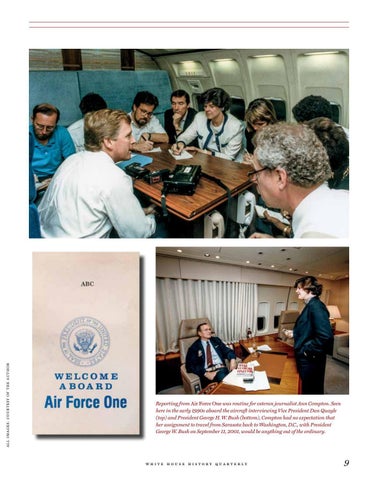 Reporting from Air Force One was routine for veteran journalist Ann Compton. Seen here in the early 1990s aboard the aircraft interviewing Vice President Dan Quayle (top) and President George H. W. Bush (bottom), Compton had no expectation that her assignment to travel from Sarasota back to Washington, D.C., with President George W. Bush on September 11, 2001, would be anything out of the ordinary.